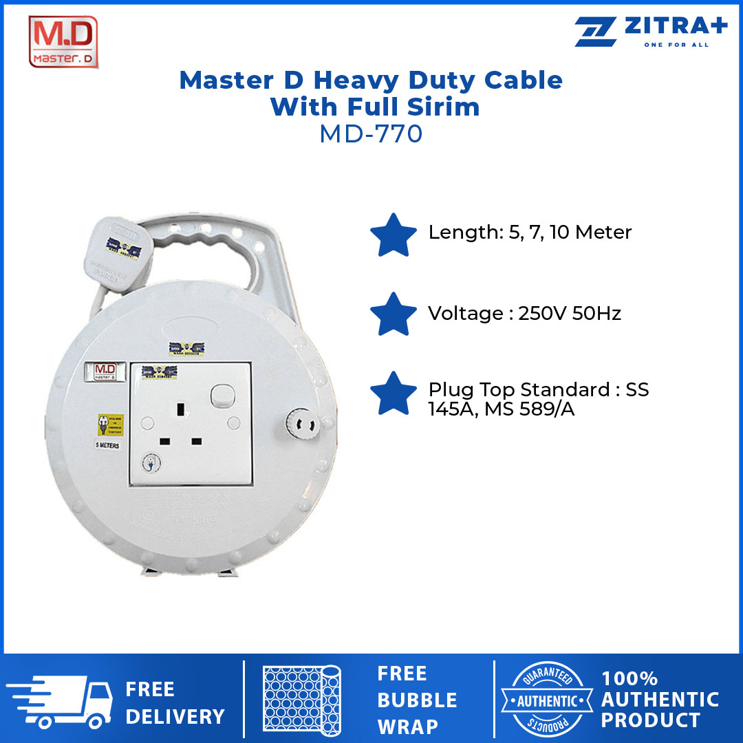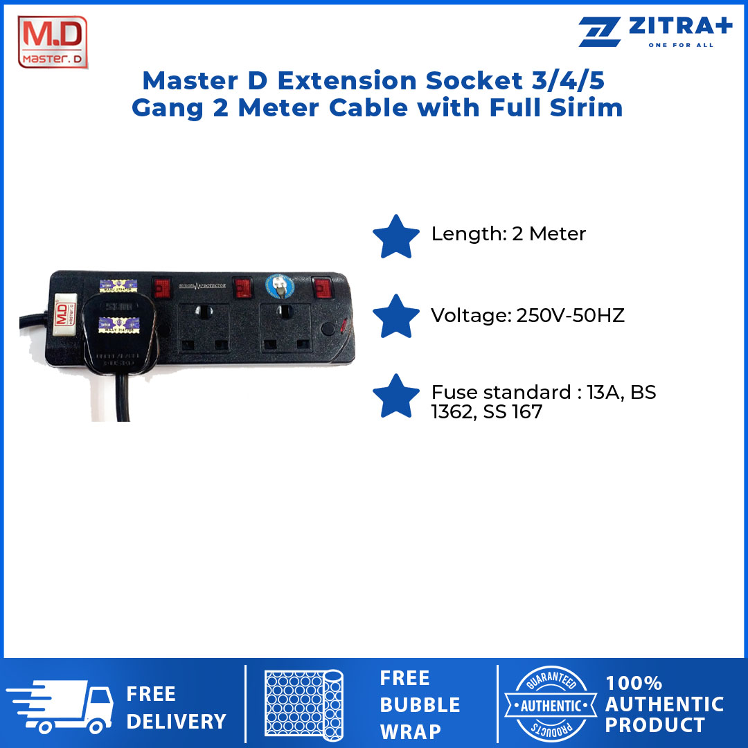Master D Extension Socket 3/4/5 Gang 2 Meter Cable with Full Sirim MD-513/514/515N | Voltage 250V-50HZ | Max Load: 13AMP | Max Rate: 2500watts |
