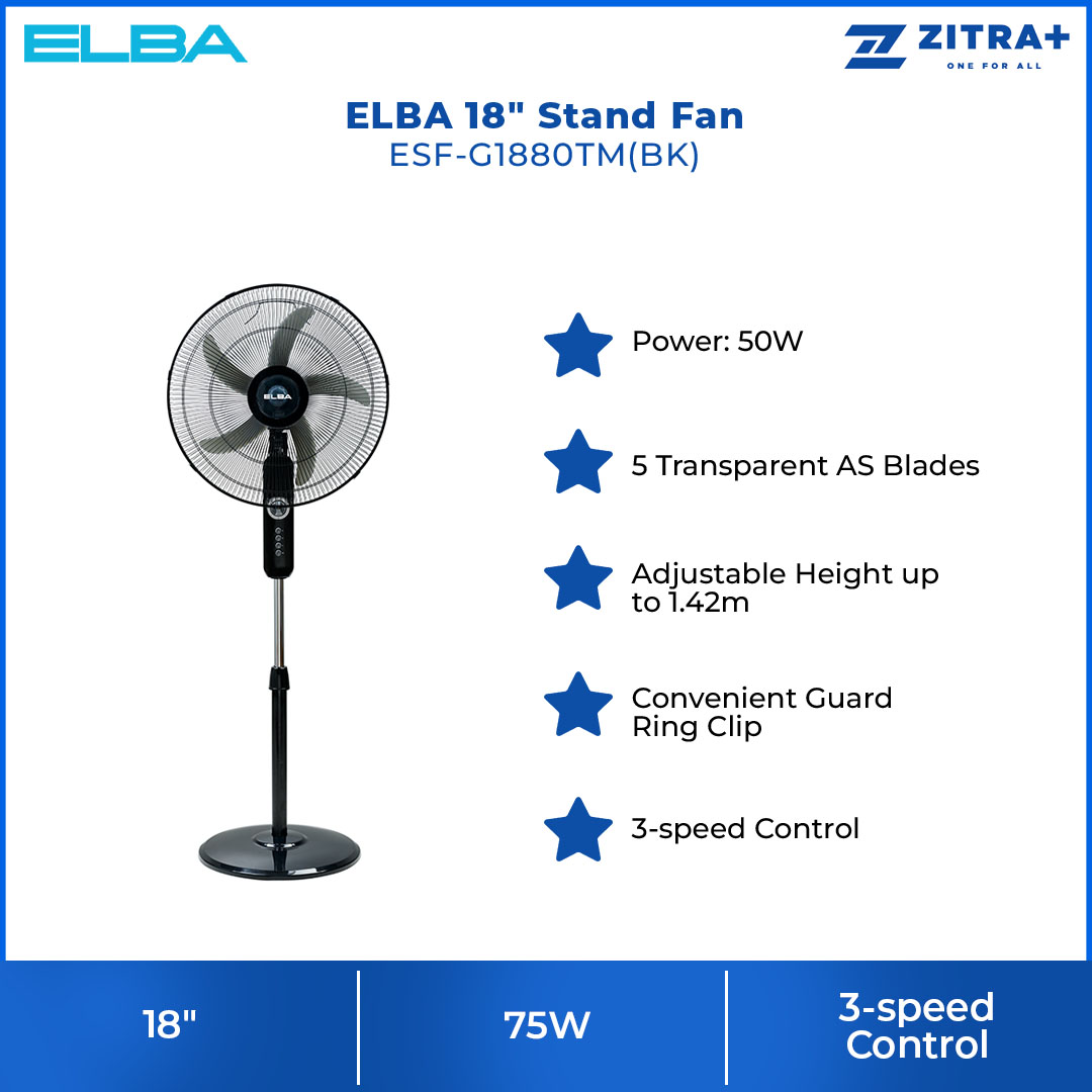 ELBA 18" Stand Fan ESF-G1880TM(BK) | 5 Transparent AS Blades | Adjustable Height | Thermal Safety Fuse | Whisper Quiet Self Lubricating Motor | Stand Fan with 1 Year Warranty