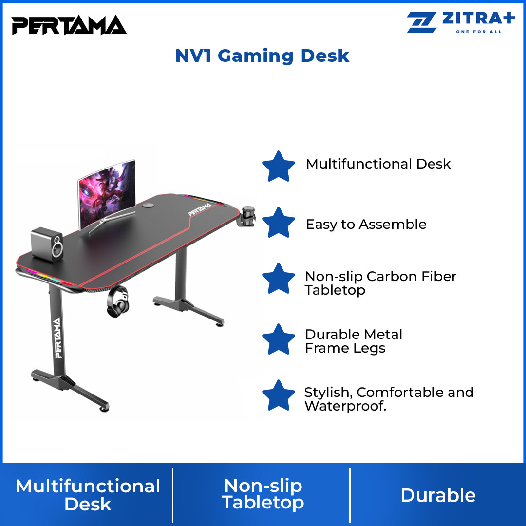 Pertama NV1 Gaming Desk Gaming Table | Non-slip Carbon Fiber Tabletop | Dimension: 140 X 60 X 75 CM | With Headset Hook & Cup Holder | Gaming Table with 2 Years Warranty