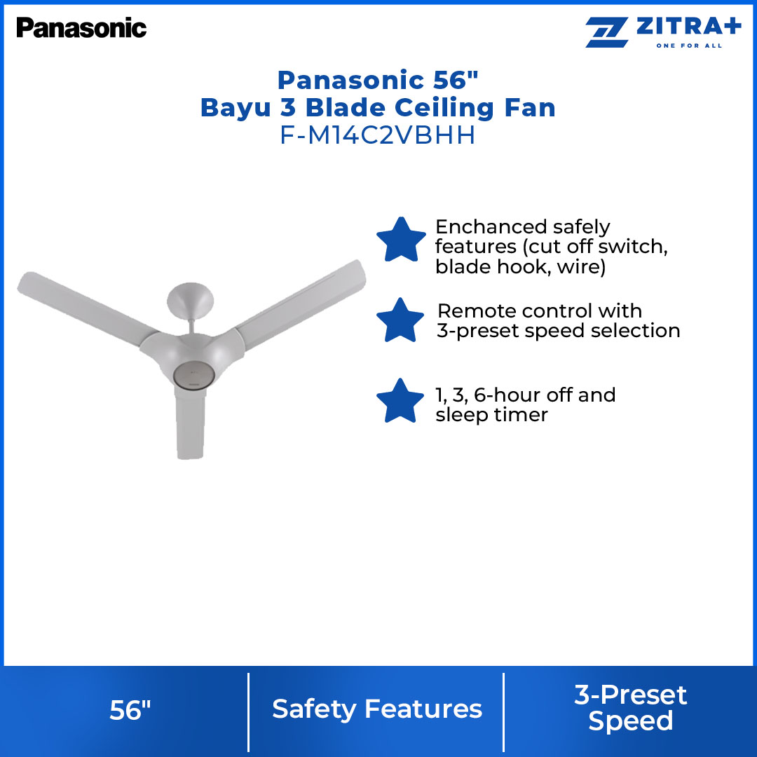 Panasonic 56" Bayu 4 Blade Ceiling Fan F-M14CZVBKH | Enhanced Safety Features | Remote Control with 3-Preset Speed Selection | 1, 3, 6-Hour Off and Sleep Timer | 3, 6-Hour Sleep Timer | Ceiling Fan with 1 Year Warranty