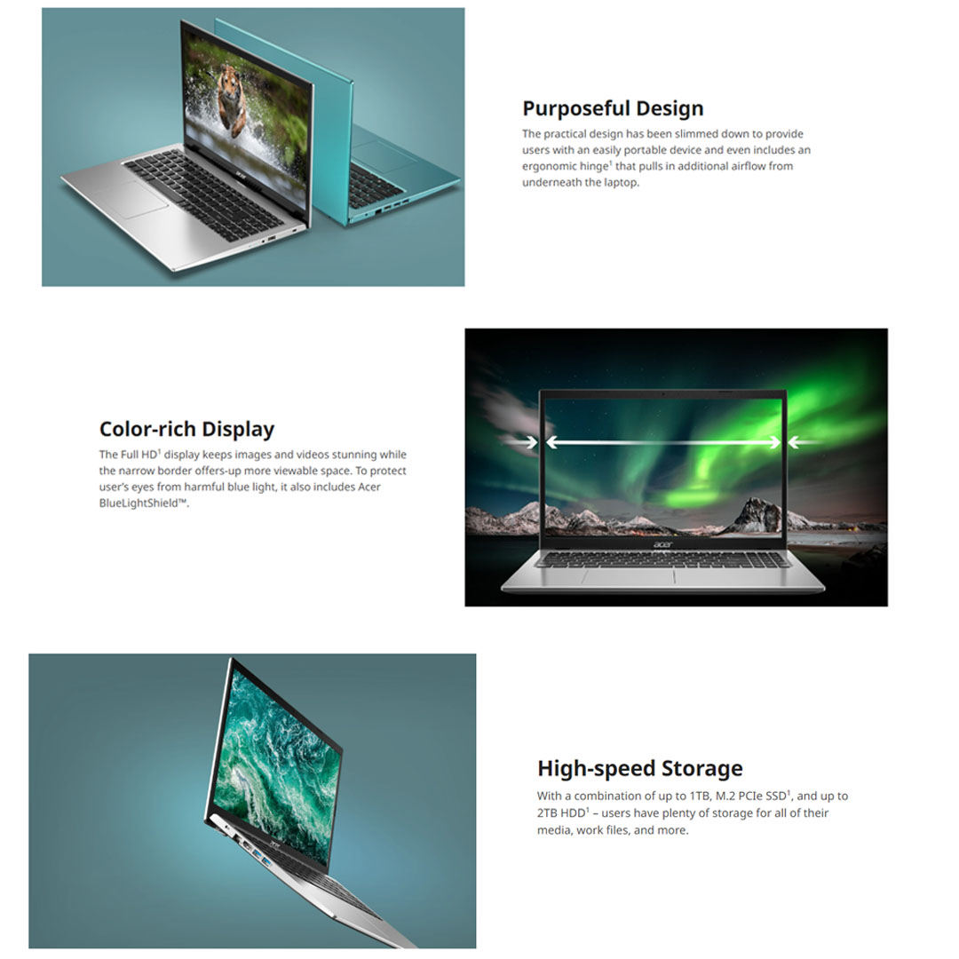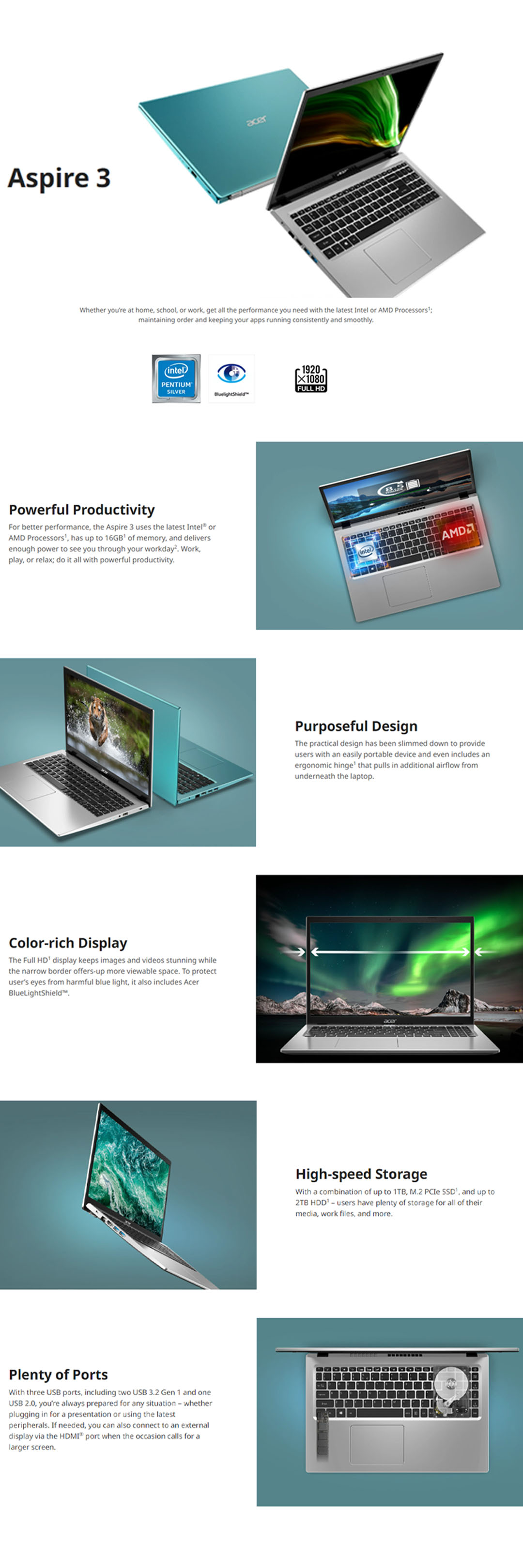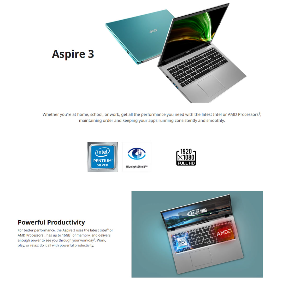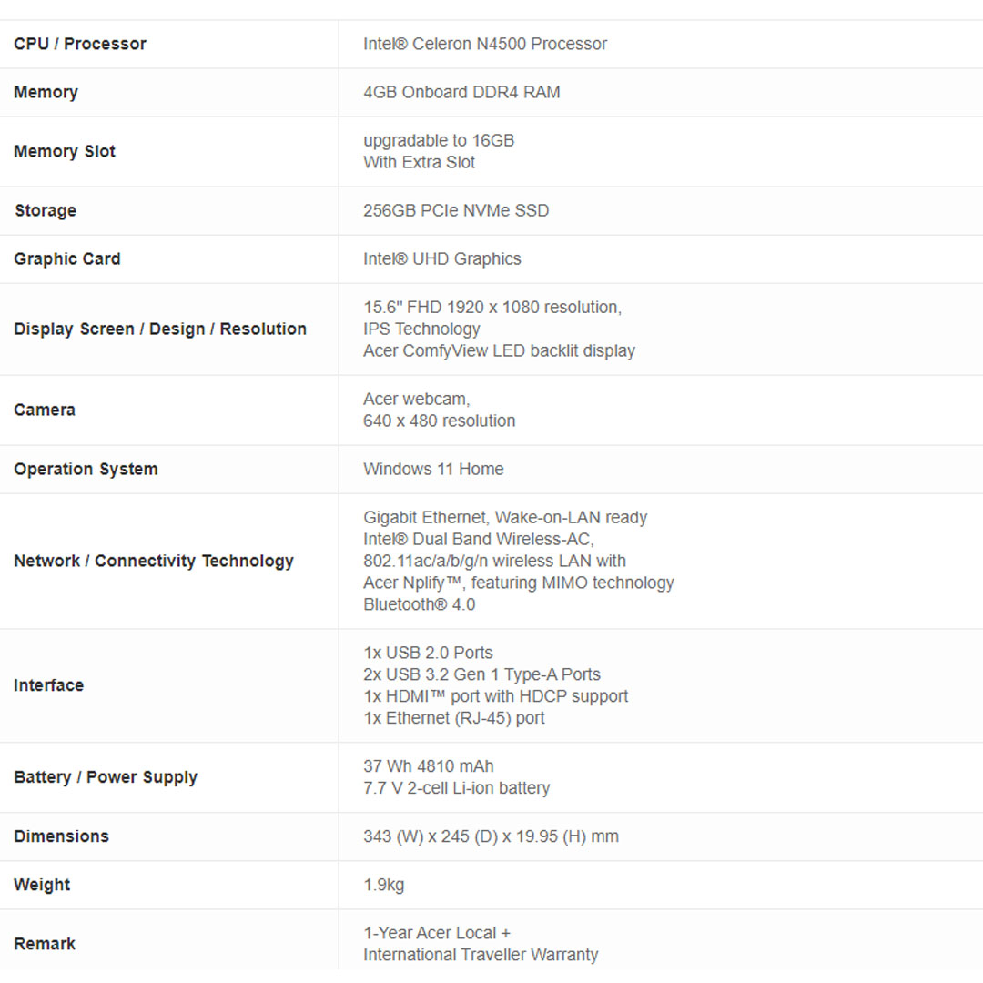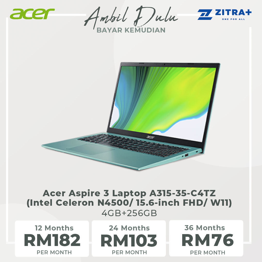 ACER Aspire 3 Laptop A315-35-C4TZ (Intel Celeron N4500/4GB+256GB SSD/15.6-inch FHD/W11) | Window 11 Home | Bluetooth 4.0 | Battery Life Up to 9 Hours | Laptop with 1 Year Warranty
