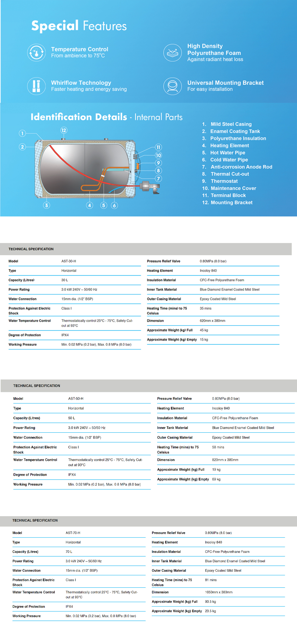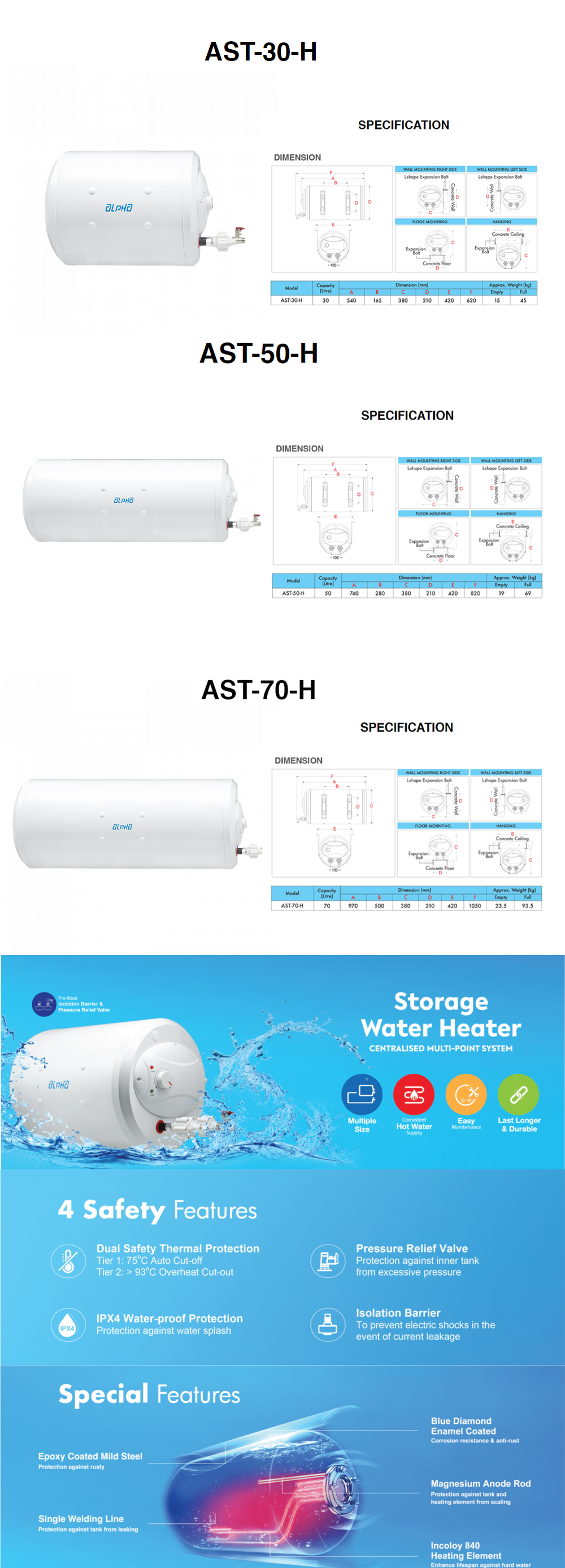 ALPHA 30L/50L/70L Horizontal Storage Water Heater AST-30-H/AST-50-H/AST-70-H | Multiple Size | Thermal Cut-Off