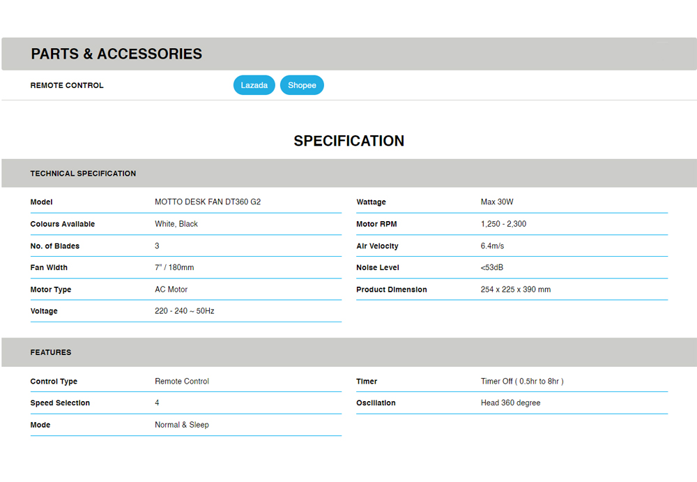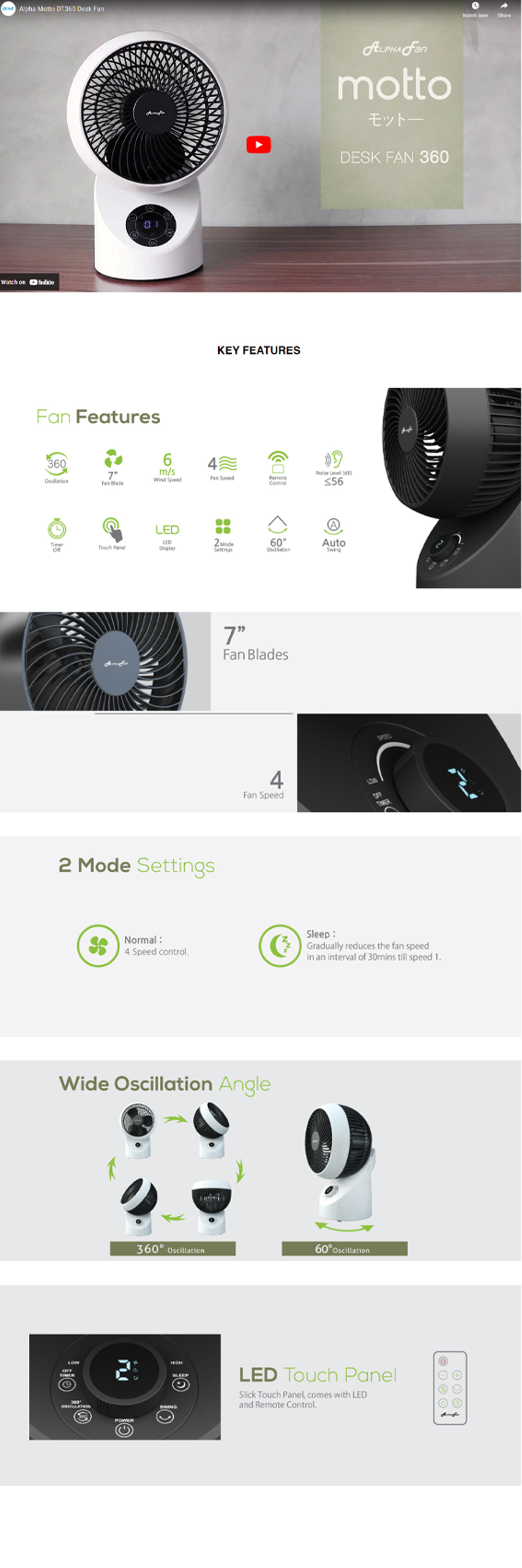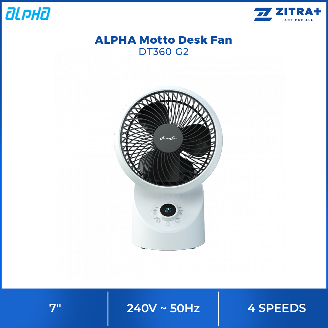 ALPHA 7" Desk Fan MOTTO DESK FAN 360 G2 | 4 Fan Speed | Remote Control | Timer Off | Touch Panel | LED Display | Auto Swing | 360 Oscillation | Desk Fan with 1 Year Warranty