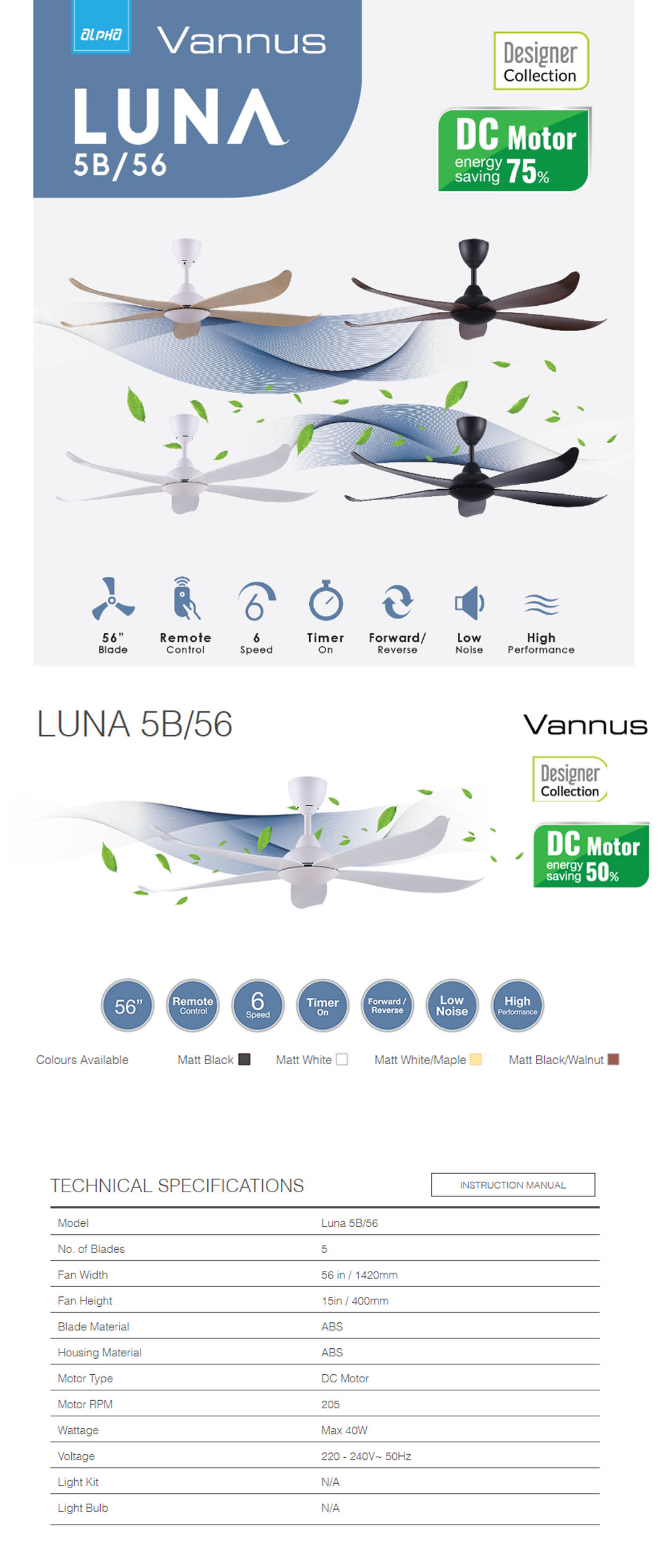 ALPHA (VANNUS) 56" 5 Blades Ceiling Fan Luna 5B/56 | Low Noise | Timer | Forward Reverse | 6 Speed | Ceiling Fan with 1 Year Warranty