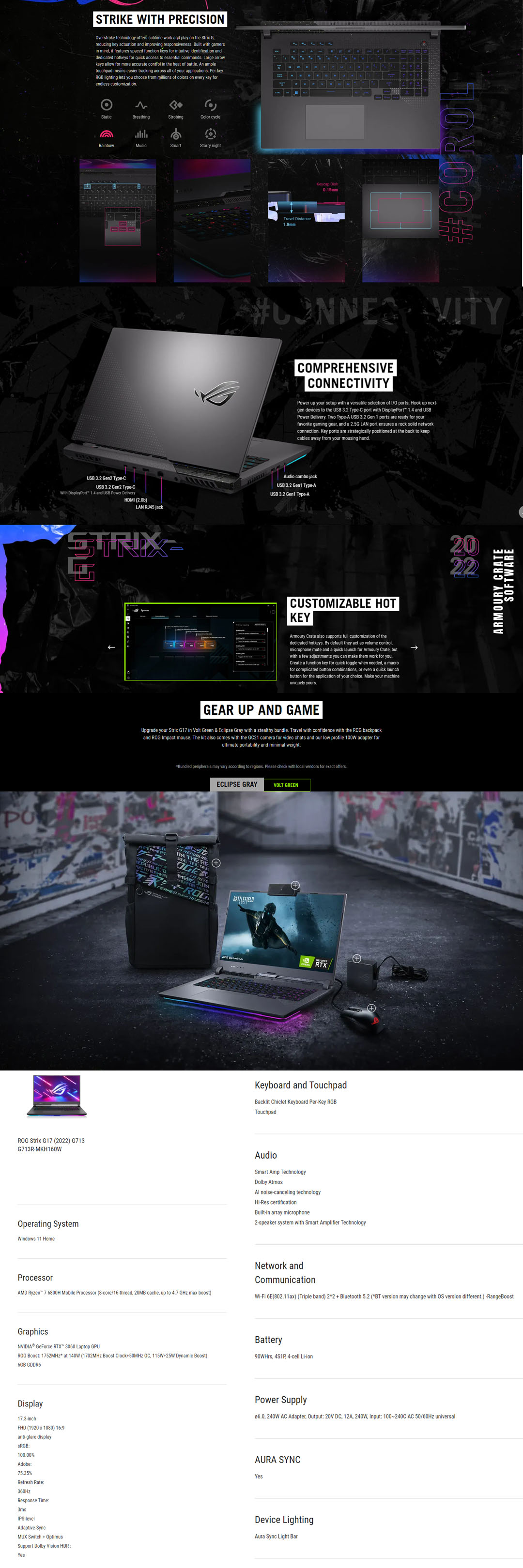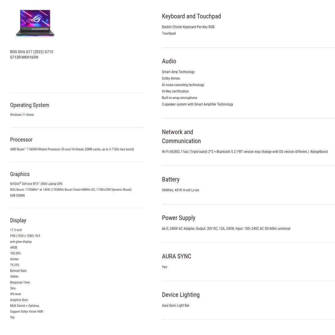 ASUS ROG Strix G17 (2022) G713 Gaming Laptop G713R-MKH160W (AMD R7-6800H/16GB/512GB SSD/NVIDIA GeForce RTX3060/17.3-inch FHD/W11) | Wi-Fi 6E | Bluetooth 5.2 | 90WHrs | Trusted Platform Module | AURA SYNC | Dolby Atmos | Gaming Laptop with 2 Year Warranty