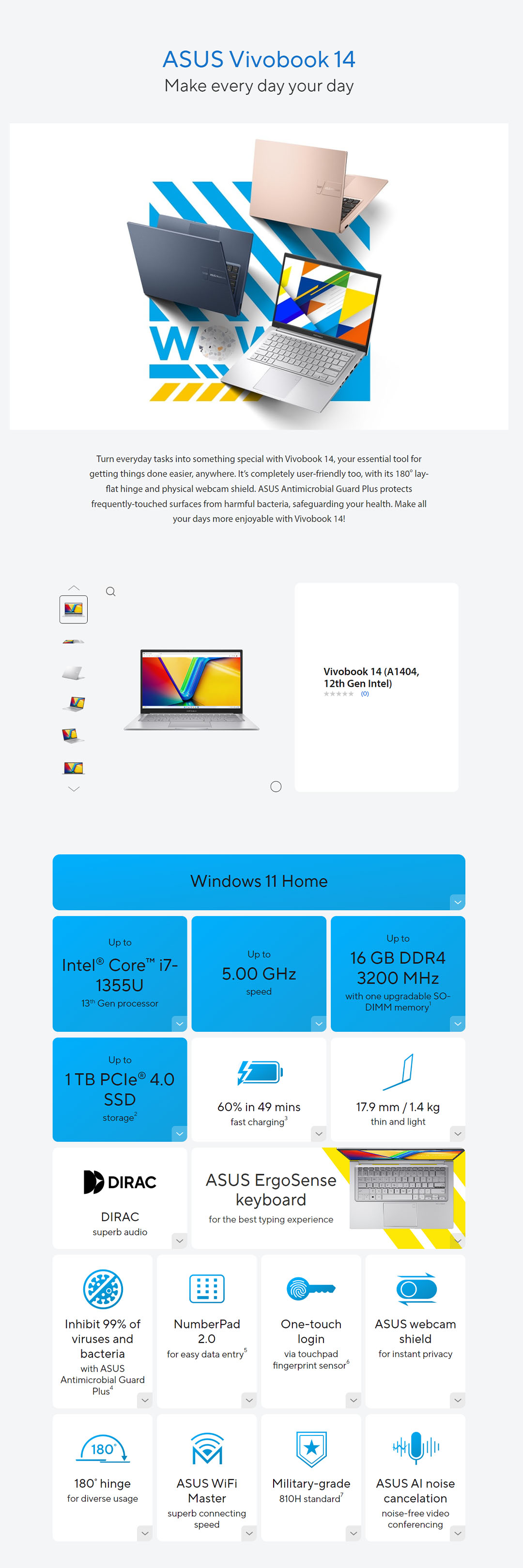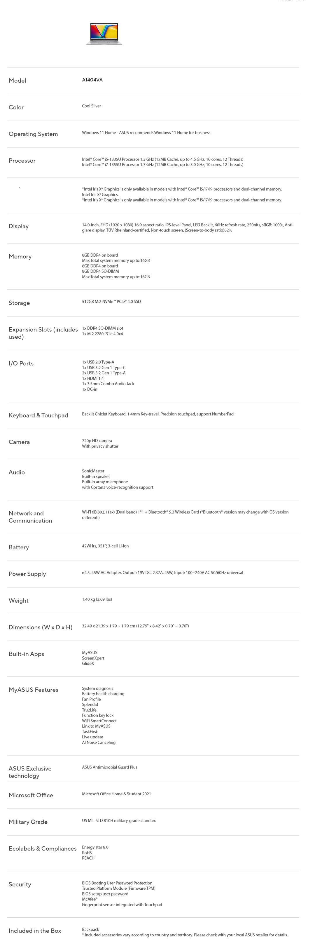 ASUS Vivobook 14-inch Intel Core i5-1335U | Intel UHD Graphics | 8GB+512GB 2021 | Windows 11 Home | Laptop with 2 Years Manufacturer Warranty