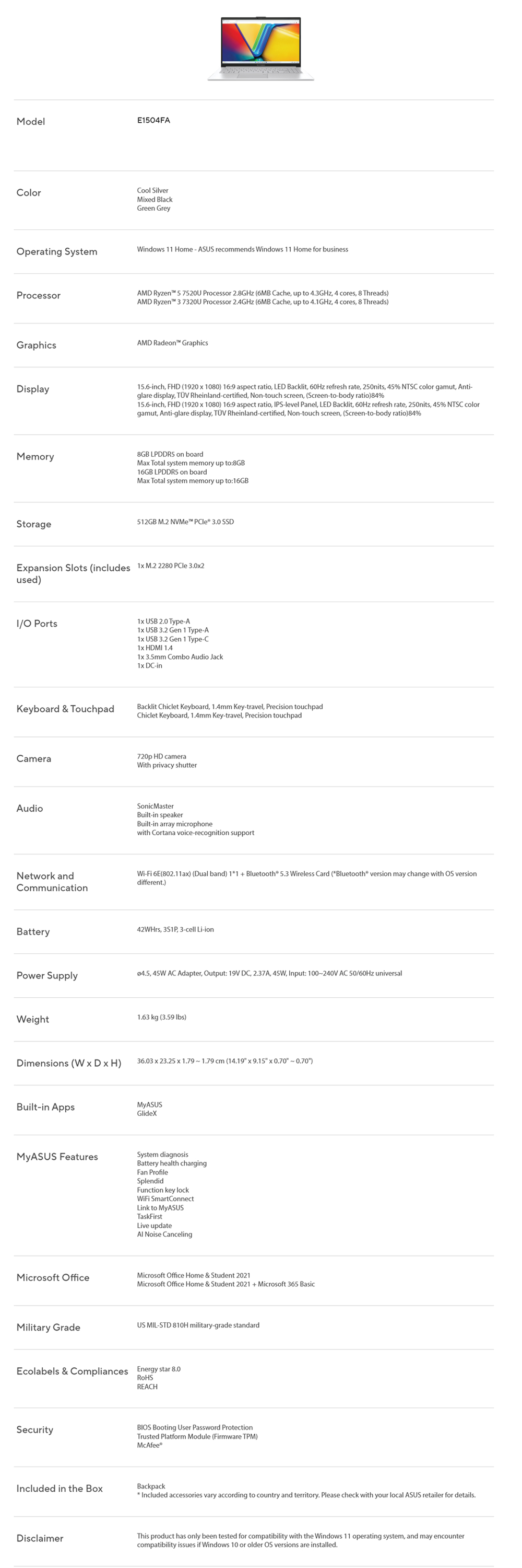 ASUS Vivobook Go 15 Laptop E1504F-ANJ468WS | ASUS Webcam Shield | ASUS AI Noise Cancelation | ASUS WiFi Master | 2 Year General Warranty