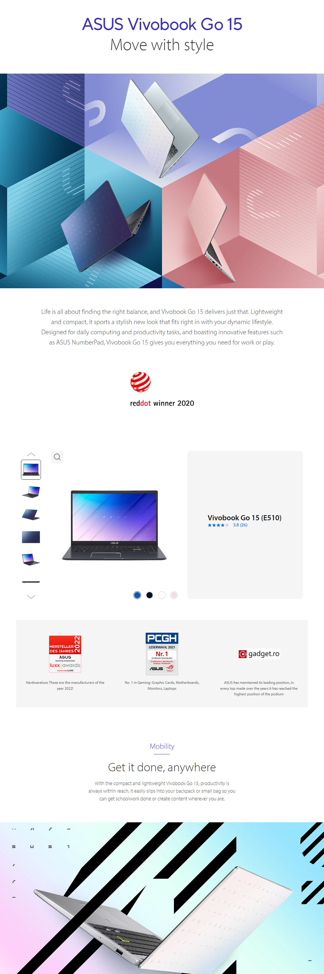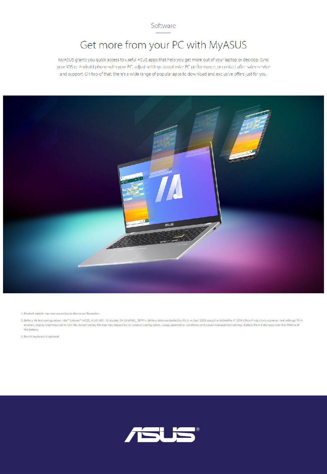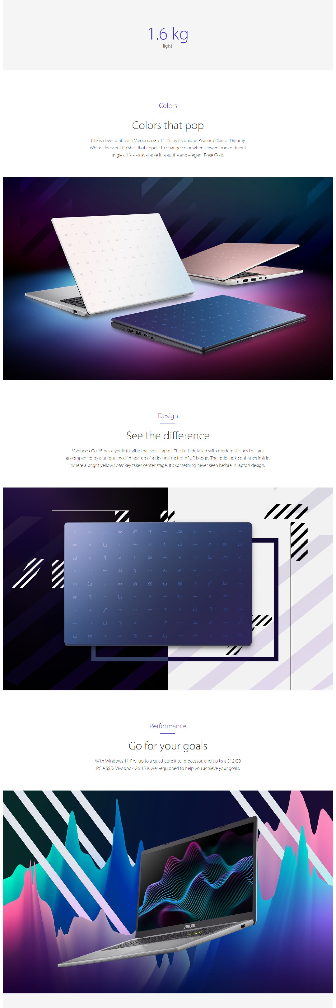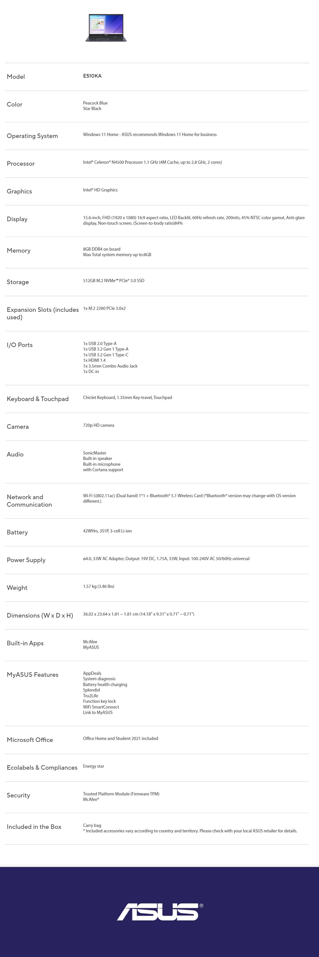 ASUS Vivobook Go 15 Laptop E510K-AEJ731WS (Intel Celeron N4500/ 8GB+512GB SSD/ 15.6-inch FHD/ W11) | Windows 11 Pro | up to Quad-core Intel processor | Up to 8-hour battery life2 | Laptop with 2 Year Warranty