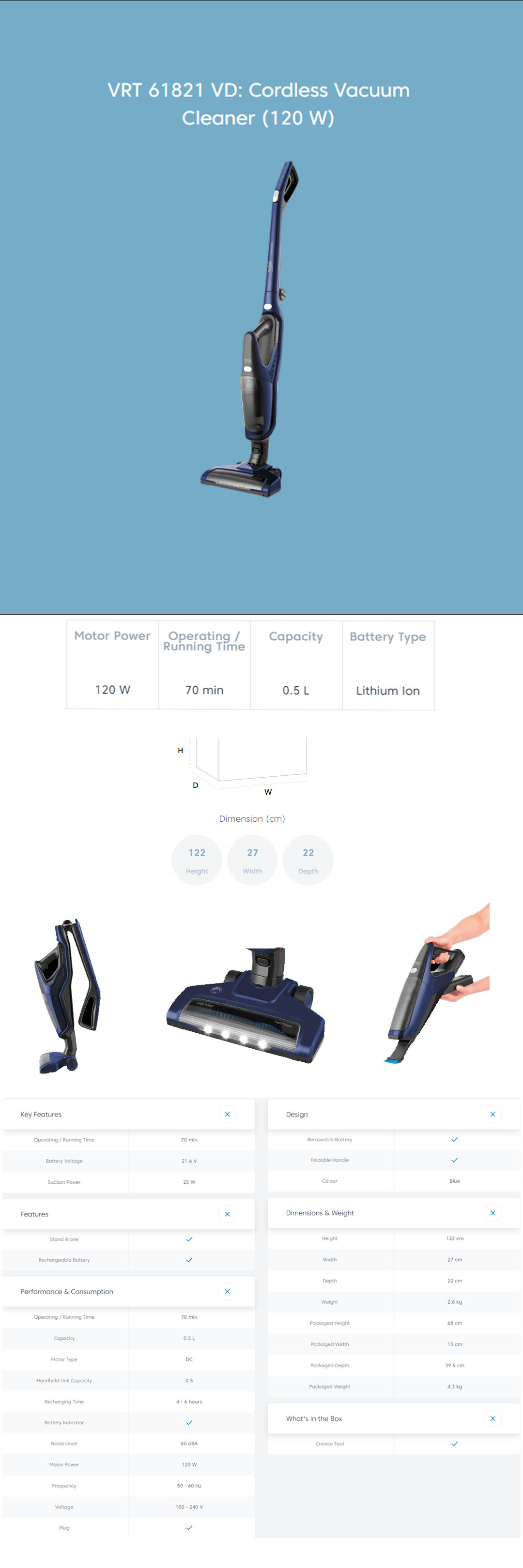 Beko 120W Cordless Vacuum Cleaner VRT 61821 VD | 70min Running Time | 11W Suction Power | Rechargeable Battery | Foldable Handle | Vacuum Cleaner with 2 Years Warranty