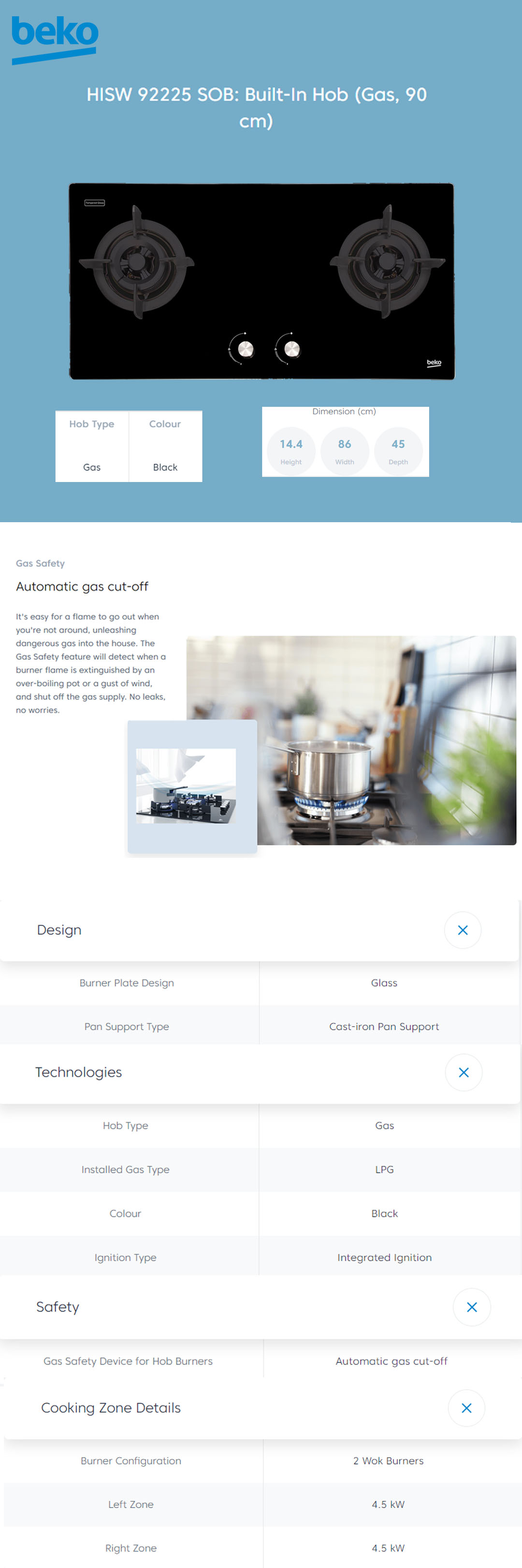 Beko 2 Burners Built-In Hob HISW 92225 SOB | Automatic Gas Cut-Off | Cast-iron Pan Support | LPG Gas Type | Integrated Ignition | Built-In Hob with 2 Years Warranty