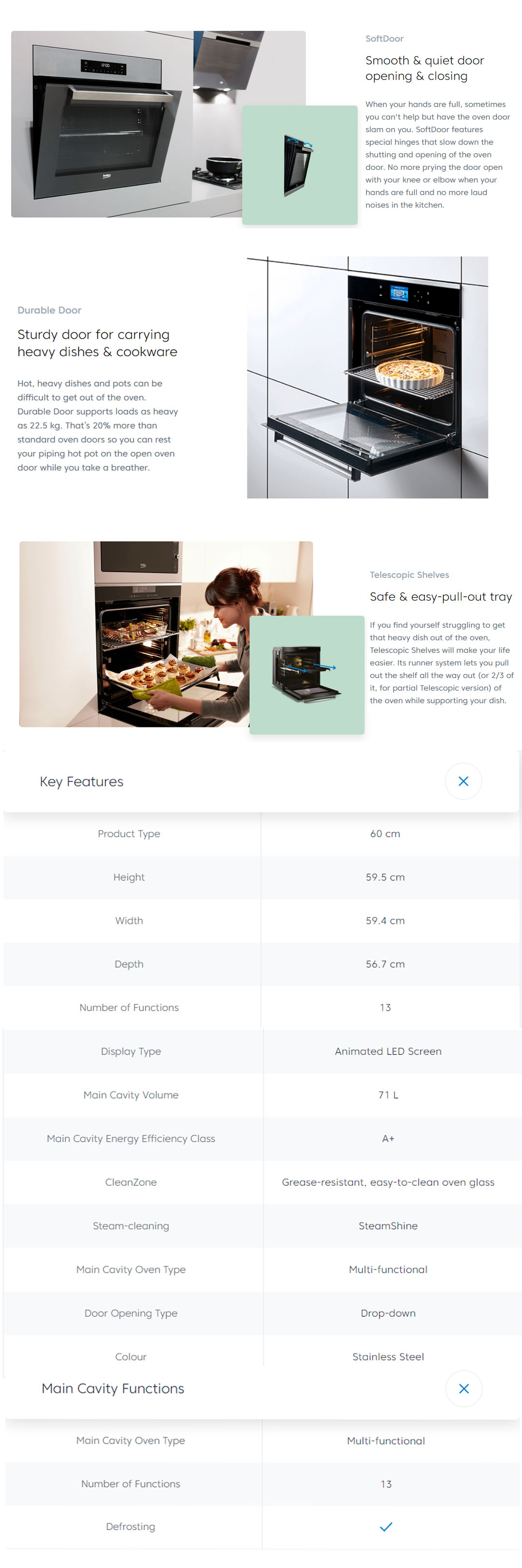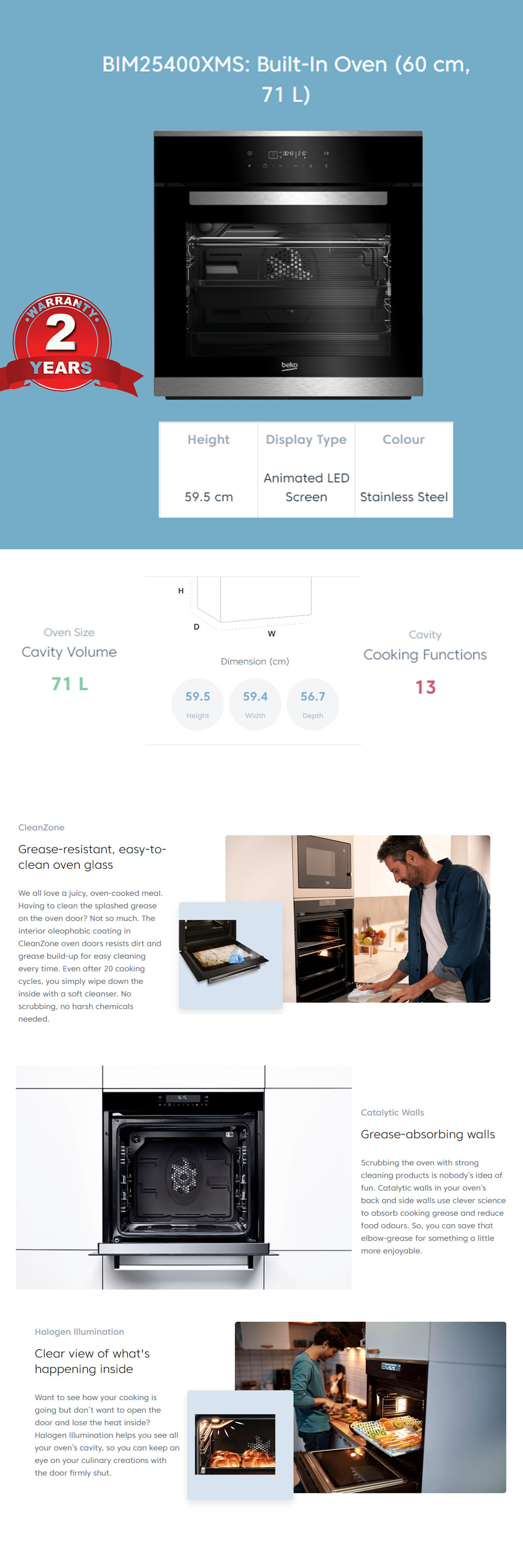 Beko 71L Built-In Oven BIM25400XMS | 13 Programs Selection | Easy-to-Clean Oven Glass | Catalytic Walls | Halogen Illumination | SoftDoor | Steam-Cleaning | Telescopic Shelves | Oven with 2 Years General Warranty & 12 Years Motor Warranty