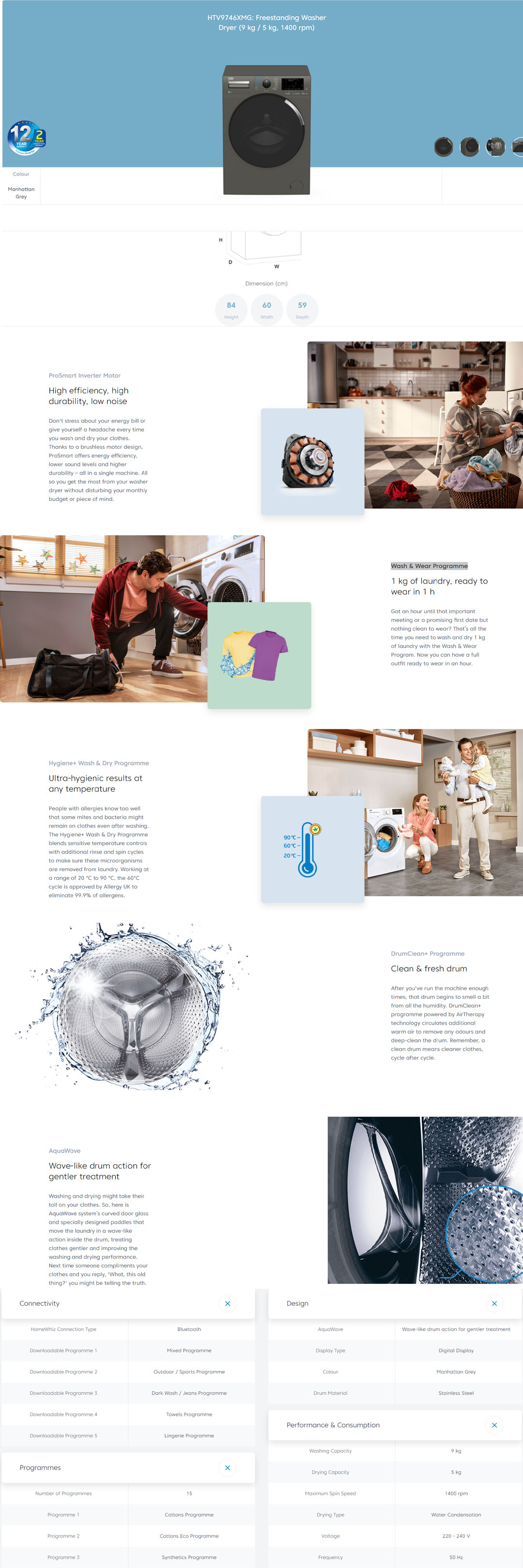 Beko 9KG/5KG Front Load ProSmart Inverter Washer Dryer HTV9746XMG | ProSmart Inverter Motor | 15 Preset Programmes | Hygiene+ Wash & Dry Programme | Washer Dryer with 2 Years General Warranty & 12 Years Motor Warranty
