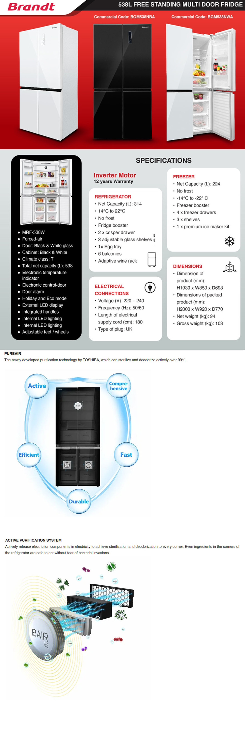 Brandt 538L 4 Doors Inverter Refrigerator BGM538NWA | Crisper Drawer | Glass Shelves | Freezer Drawers | Refrigerator with 1 Year Warranty