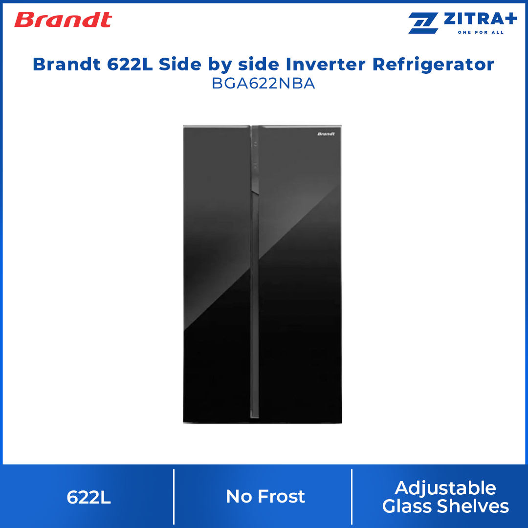 Brandt 622L Side by side Inverter Refrigerator BGA622NBA | Adjustsble Glass Shelves | Door Alarm | Forced - Air | Refrigerator witn 1 Year Warranty