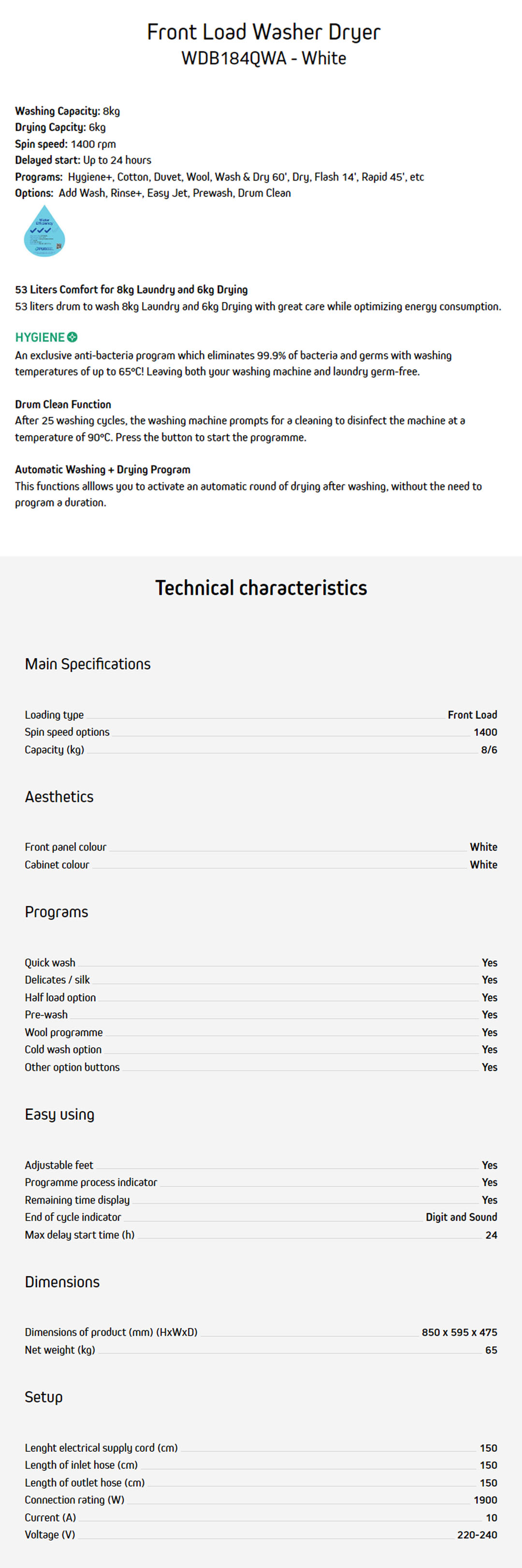Brandt 8KG/6KG Front Load Inverter Washer Dryer WDB184QWA | Hygiene+ | Drum Clean Function | Up to 24 hours | Washer Dryer with 1 Year Warranty