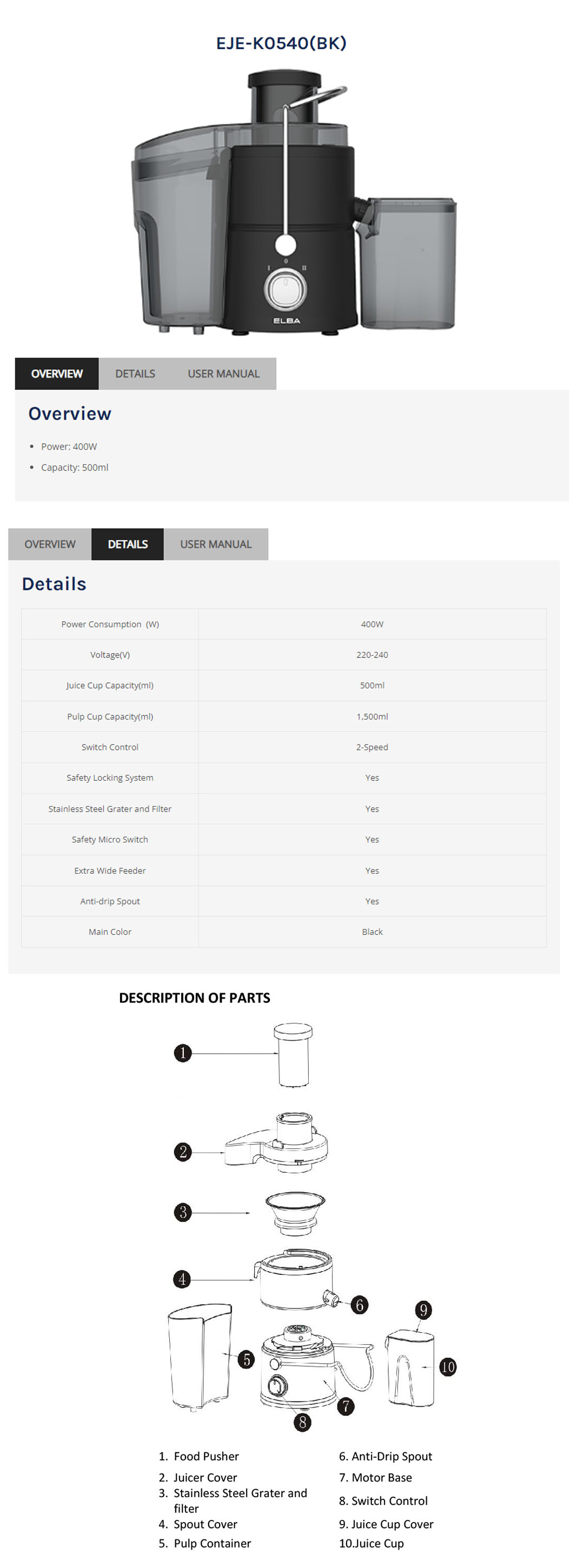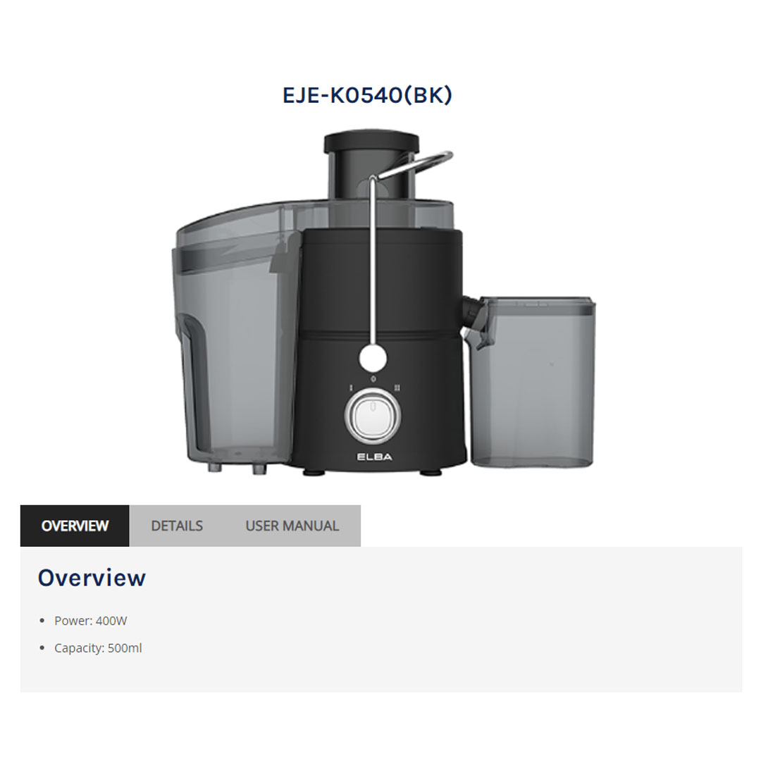 ELBA 0.5L Juice Extractor EJE-K0540(BK) | 2-Speed | Safety Locking System | Stainless Steel Grater and Filter | Anti-drip Spout | Juice Extractor with 1 Year Warranty