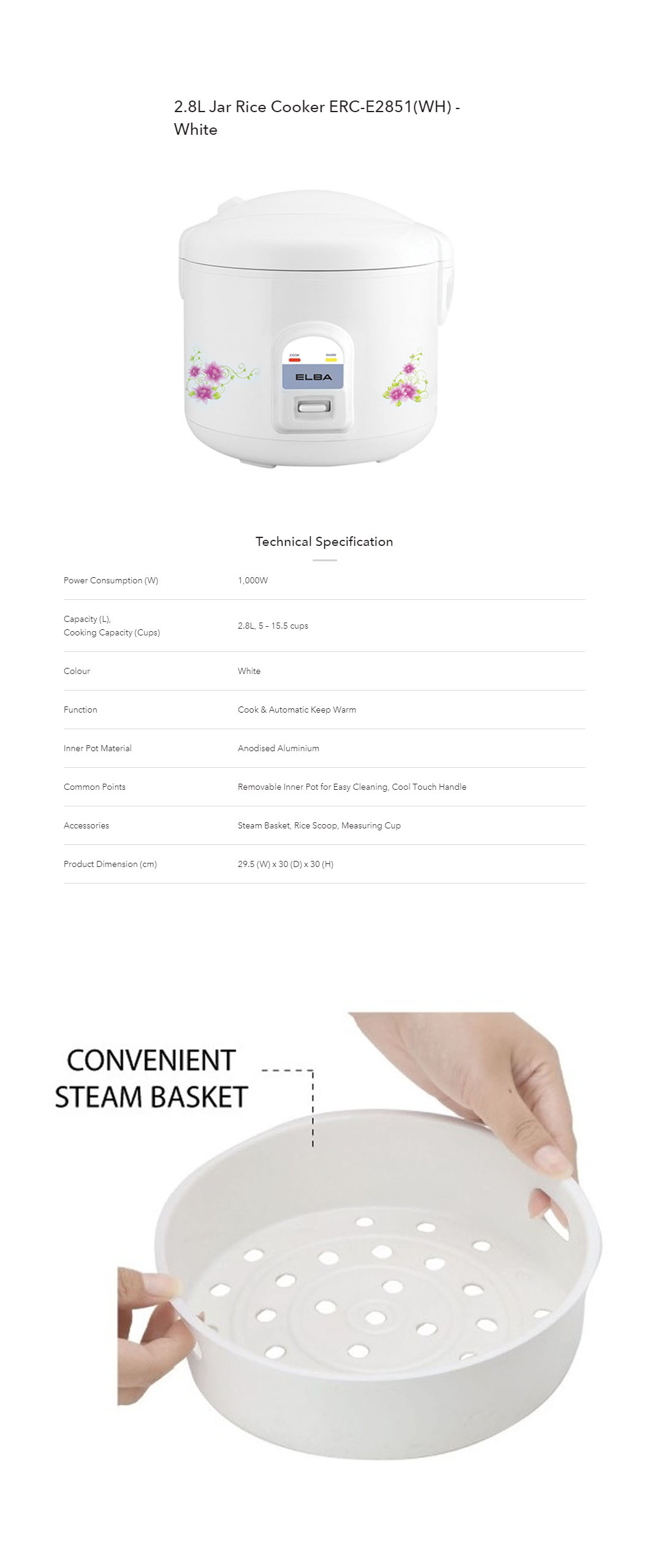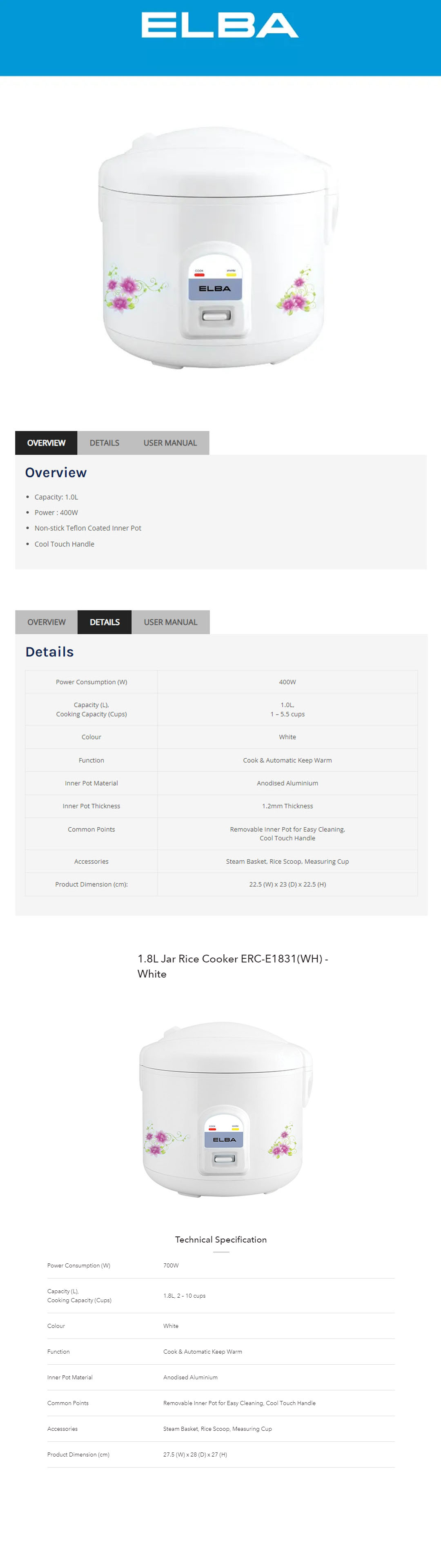 ELBA 1.0L / 1.8L / 2.8L Rice Cooker ERC-E1031(WH) / ERC-E1831(WH) / ERC-E2851(WH) | Non-stick Teflon Coated Inner Pot | Cool Touch Handle | Cook & Automatic Keep Warm | Rice Cooker with 1 Year Warranty