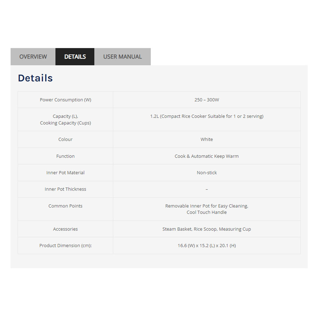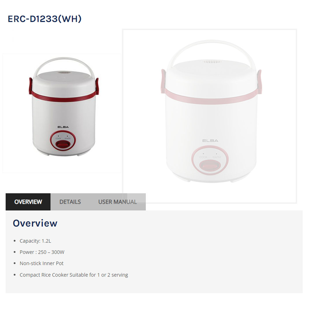 ELBA 1.2L Jar Rice Cooker ERC-D1233(WH) | Non-stick Inner Pot | Compact Rice Cooker Suitable for 1 or 2 serving | Removable Inner Pot for Easy Cleaning | Rice Cooker with 1 Year Warranty