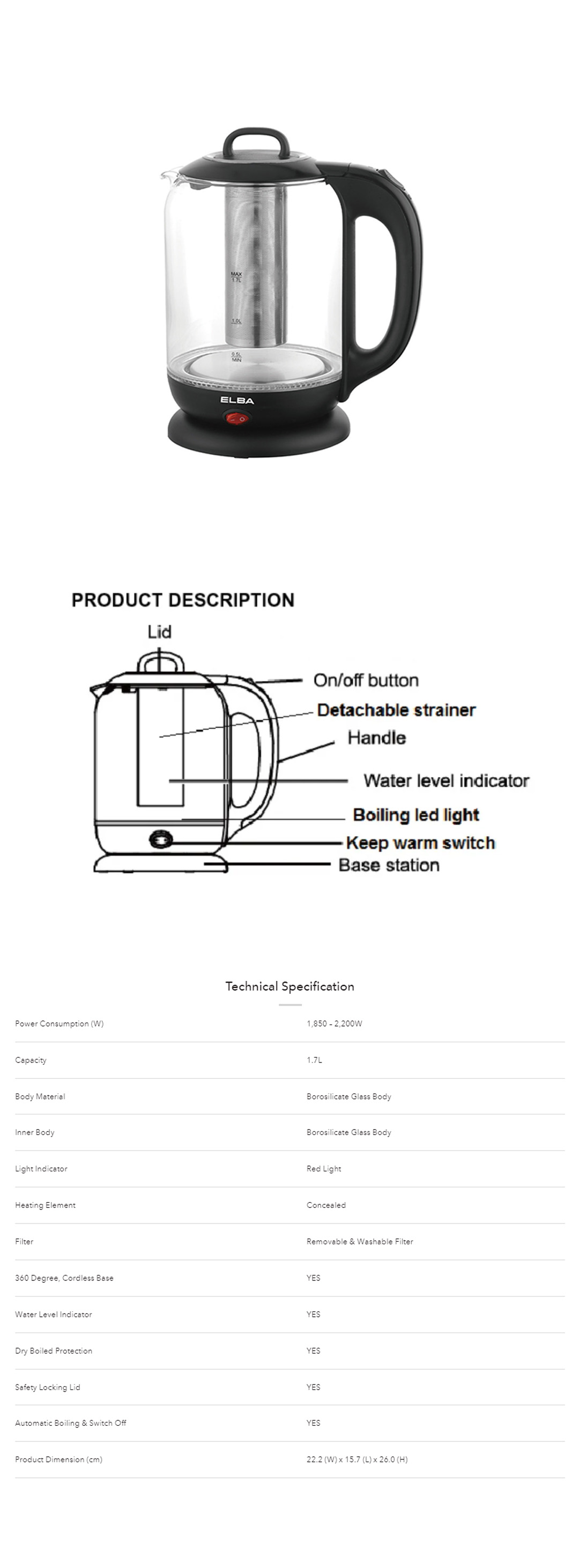 ELBA 1.7L Jug Kettle EJK-J1725KG(BK) | Water Level Indicator | Dry Boiled Protection | Automatic Boiling & Switch Off | Jug Kettle with 1 Year Warranty