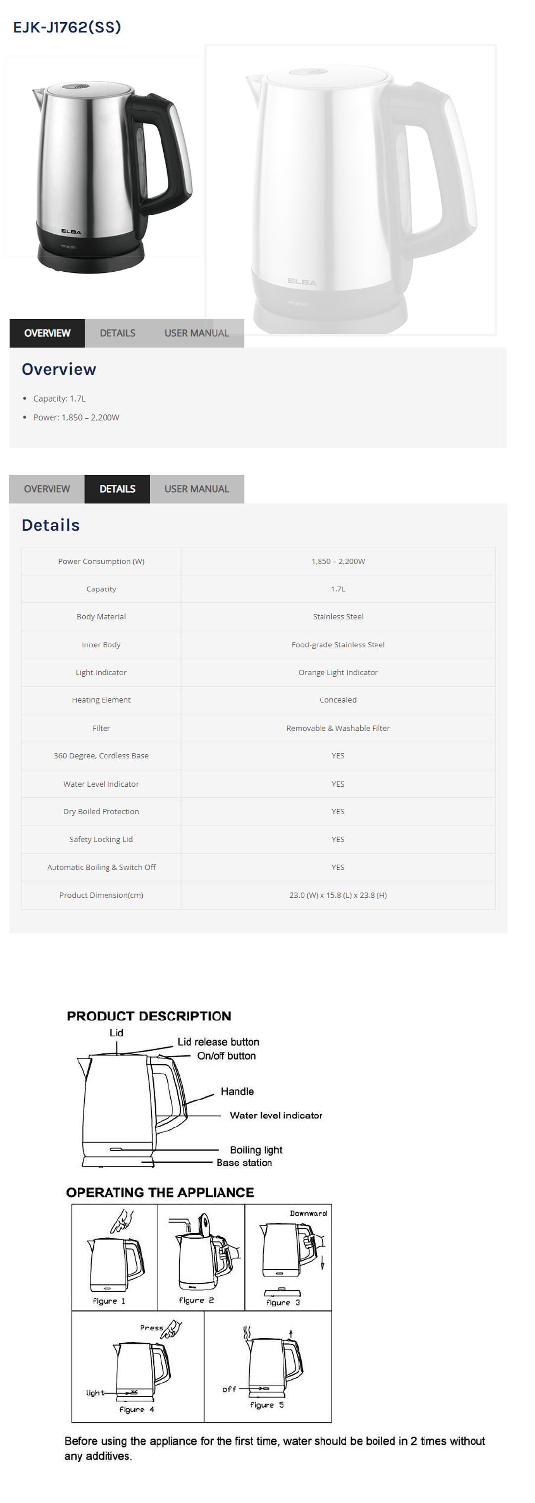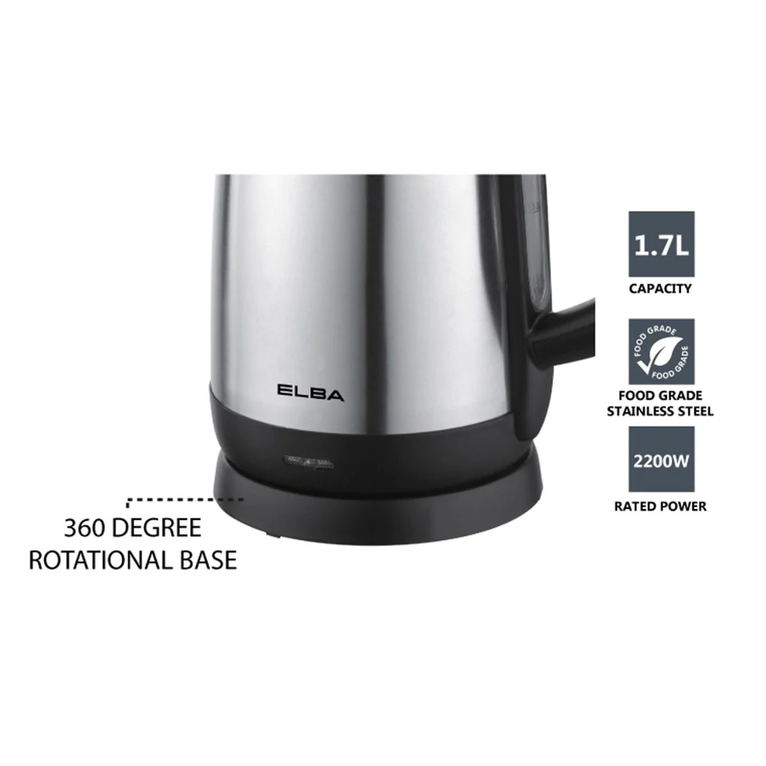 ELBA 1.7L Kettle Stainless Steel EJK-J1762(SS) | Dry Boiled Protection | Automatic Boiling & Switch Off | Removable & Washable Filter | Kettle with 1 Year Warranty