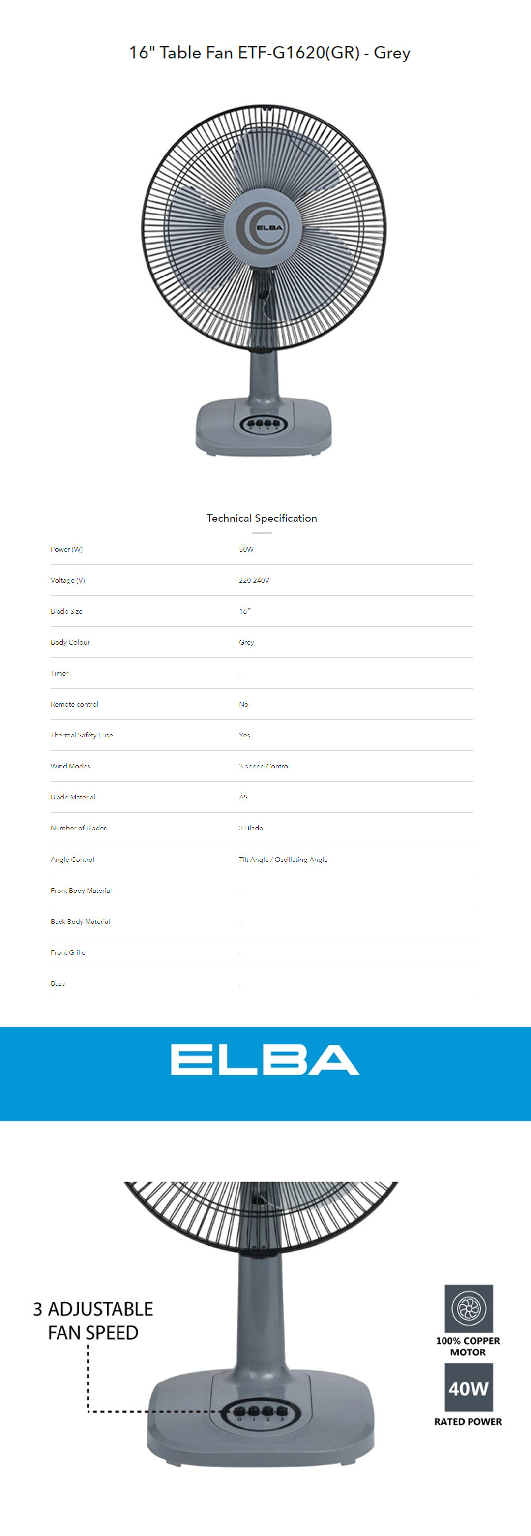 ELBA 12" / 16" Table Fan ETF-G1220(GR) / ETF-G1620(GR) | 3 Transparent AS Blades | 3-speed Control | Thermal Safety Fuse | Whisper Quiet Self Lubricating Motor | Table Fan with 1 Year Warranty