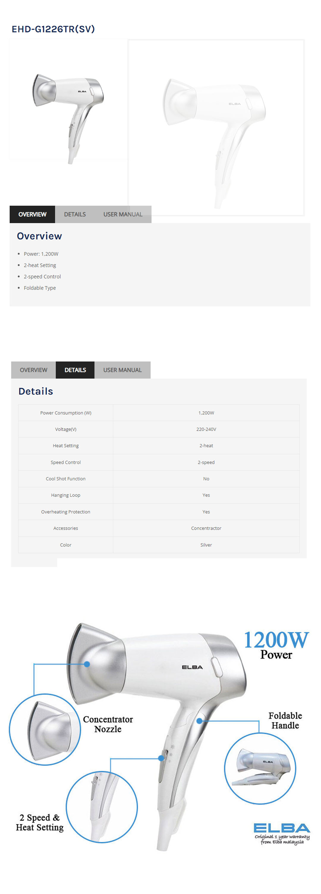 ELBA 1200W Hair Dryer EHD-G1226TR(SV) | Overheating Protection | 2 Speed Control | 2 Heat Setting | Foldable Type | Hair Dryer with 1 Year Warranty