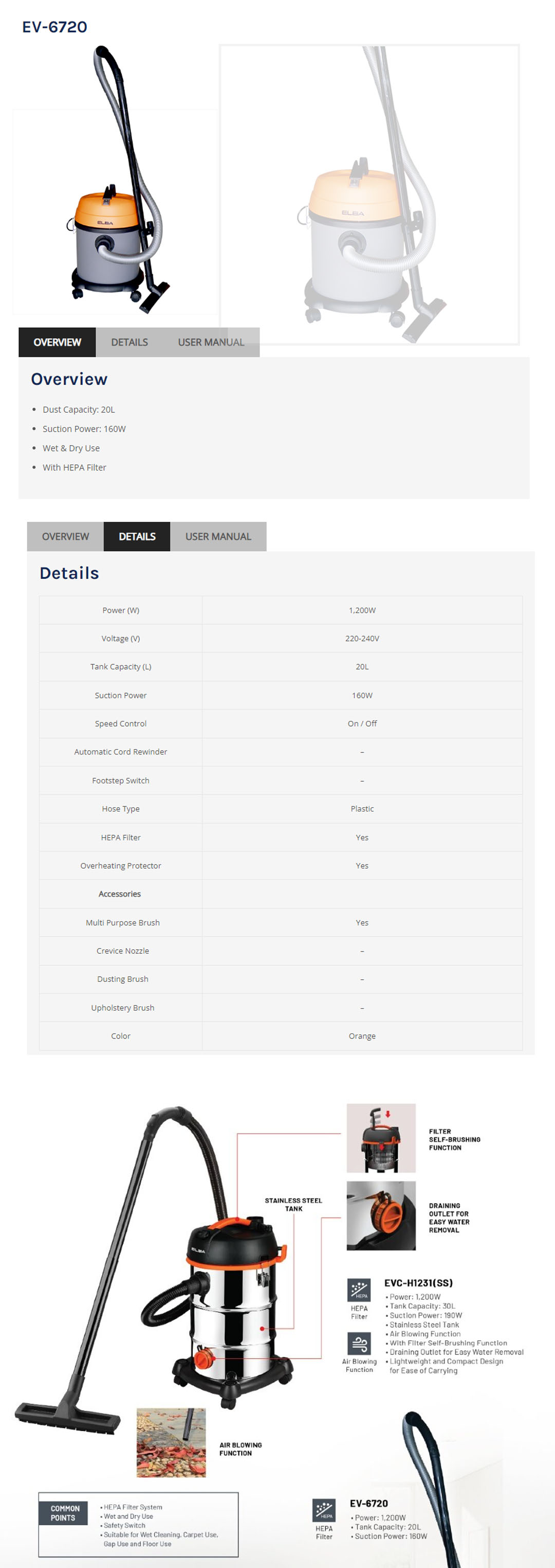 ELBA 1200W Wet & Dry Vacuum Cleaner EV-6720 | With HEPA Filter | Suction Power: 160W | Dust Capacity: 20L | Vacuum Cleaner with 1 Year Warranty