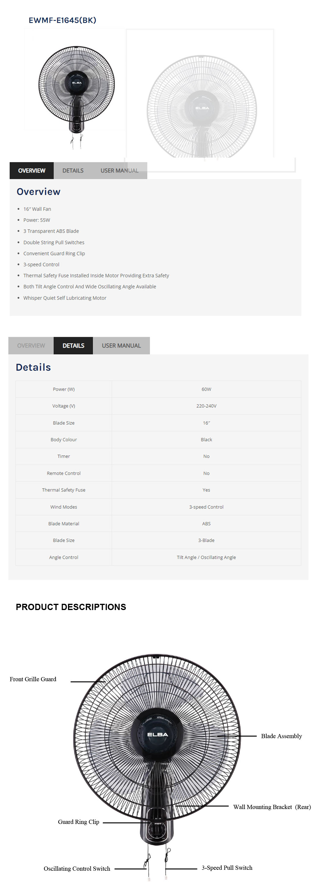 ELBA 16" Wall Fan EWMF-E1645(BK) | 3 Transparent ABS Blade | 3-speed Control | Thermal Safety Fuse | Whisper Quiet Self Lubricating Motor | Wall Fan with 1 Year Warranty