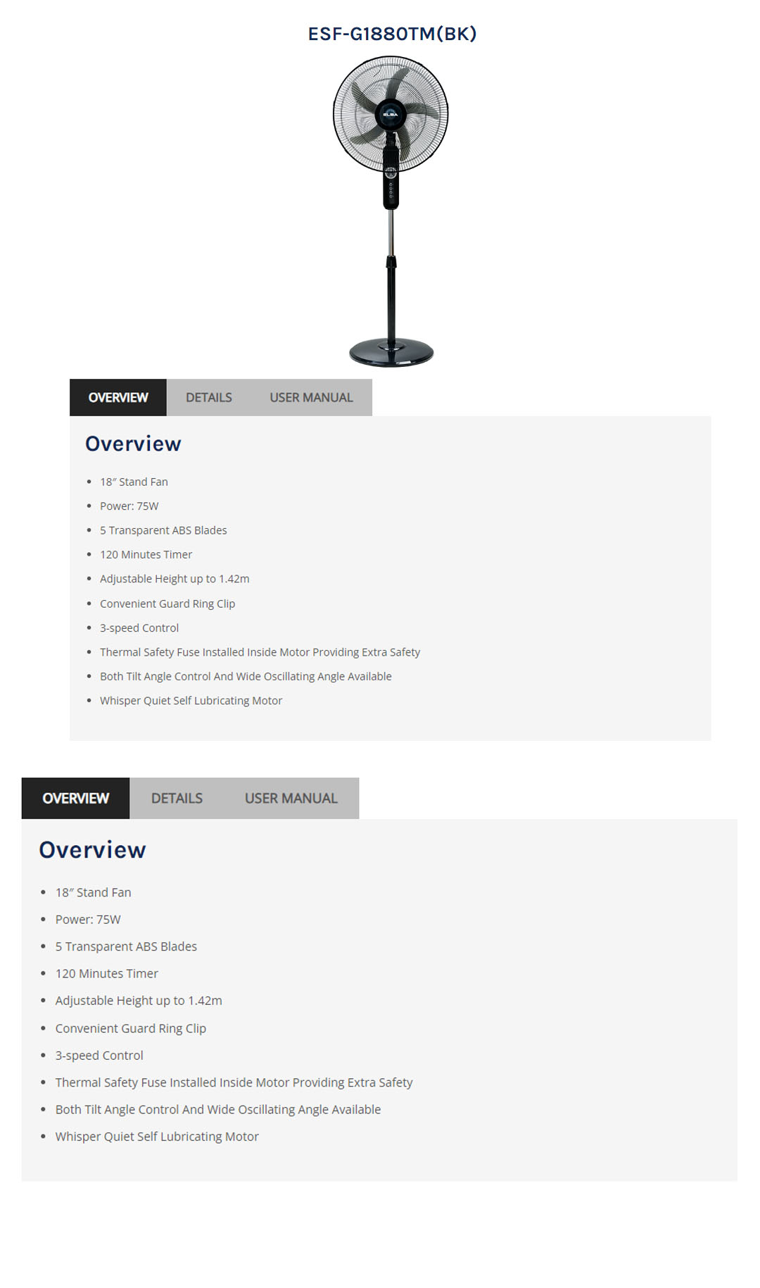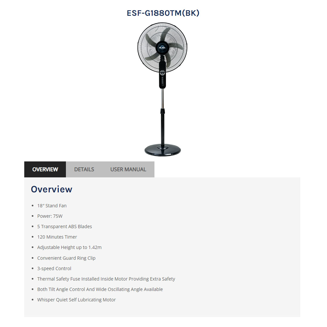 ELBA 18" Stand Fan ESF-G1880TM(BK) | 5 Transparent AS Blades | Adjustable Height | Thermal Safety Fuse | Whisper Quiet Self Lubricating Motor | Stand Fan with 1 Year Warranty