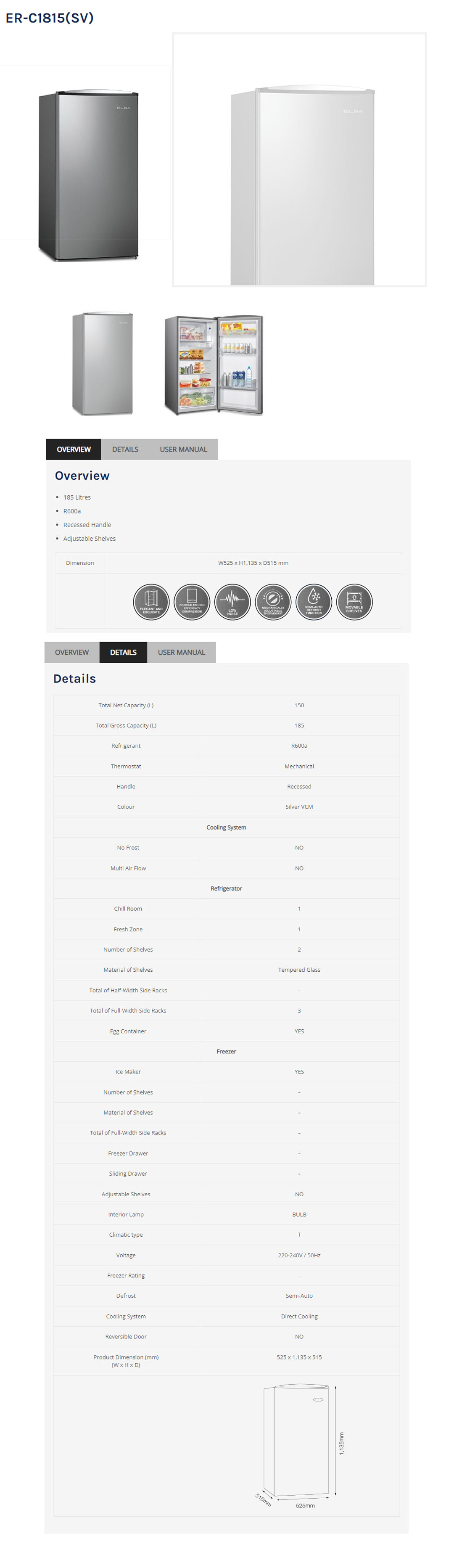 ELBA 185L 1 Door Refrigerator ER-C1815(SV) | Adjustable Shelves | Recessed Handle | Semi Auto Defrost Function | Refrigerator with 1 Year General Warranty & 5 Years Compressor Warranty