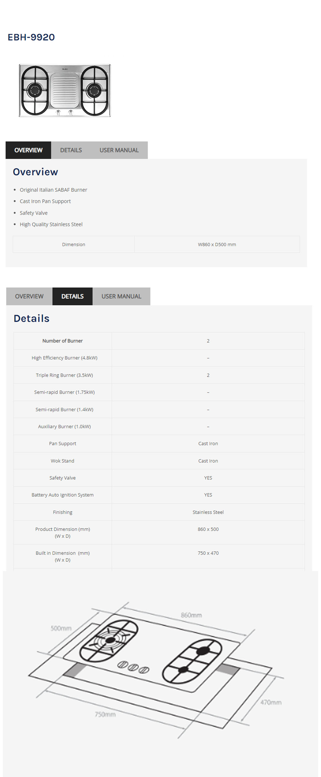 ELBA 2 burners Built-In Stainless Steel Hob EBH-9920 | Original Italian SABAF Burner | Cast Iron Pan Support | Safety Valve | Hob with 1 Year Warranty