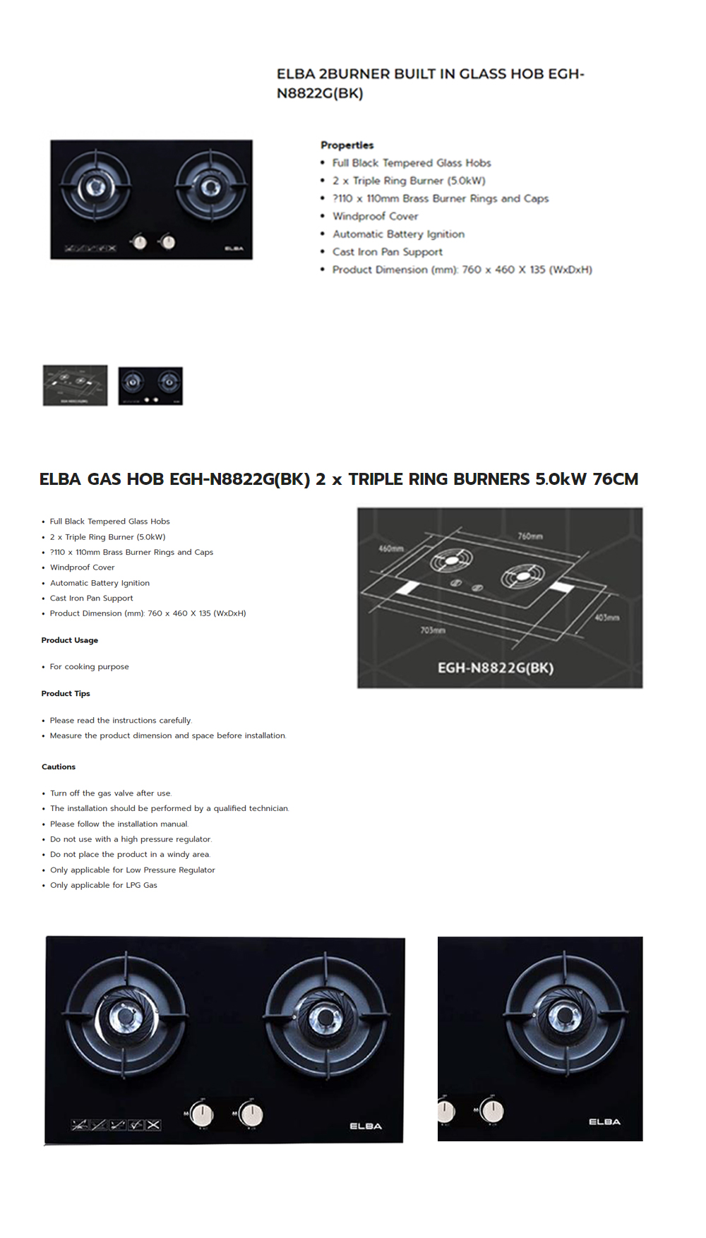 ELBA 2 Burners Glass Stove EGH-N8822G(BK) | High Quality Tempered Glass | Battery Auto Ignition System