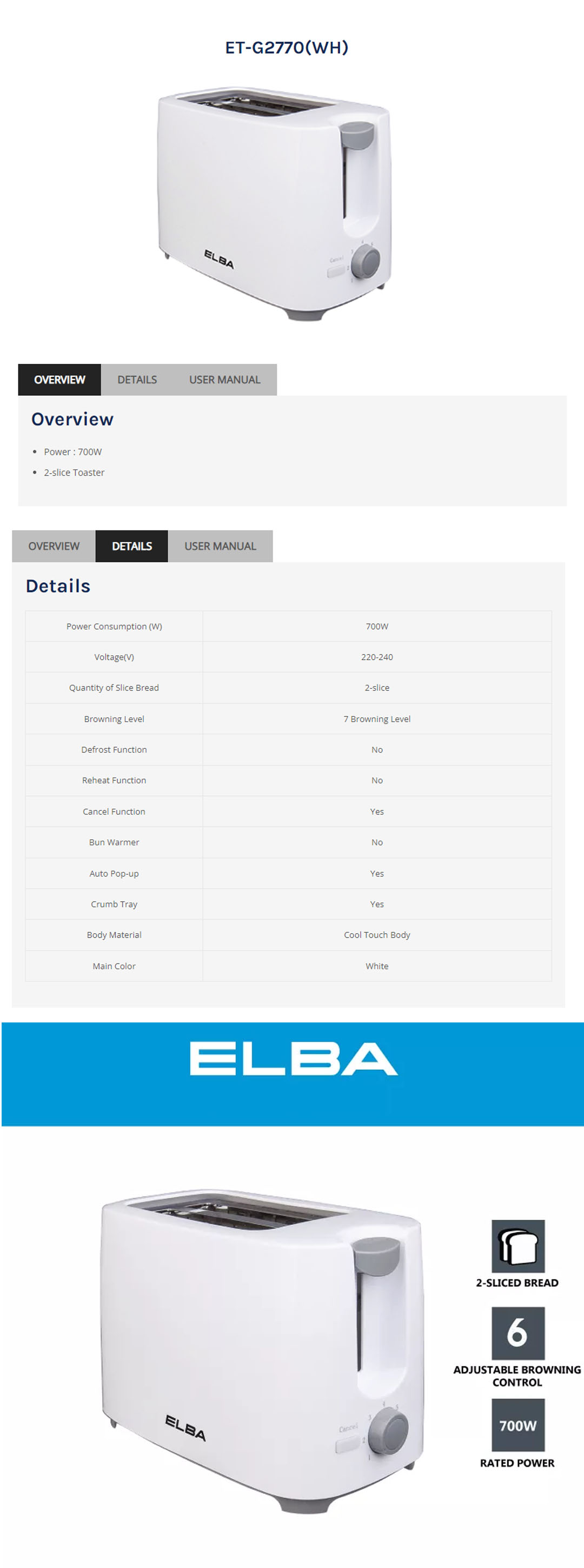 ELBA 2 Slice Bread Toaster ET-G2770(WH) | 7 Browning Level | Auto Pop-up | Crumb Tray | Cancel Function | Bread Toaster with 1 Year Warranty