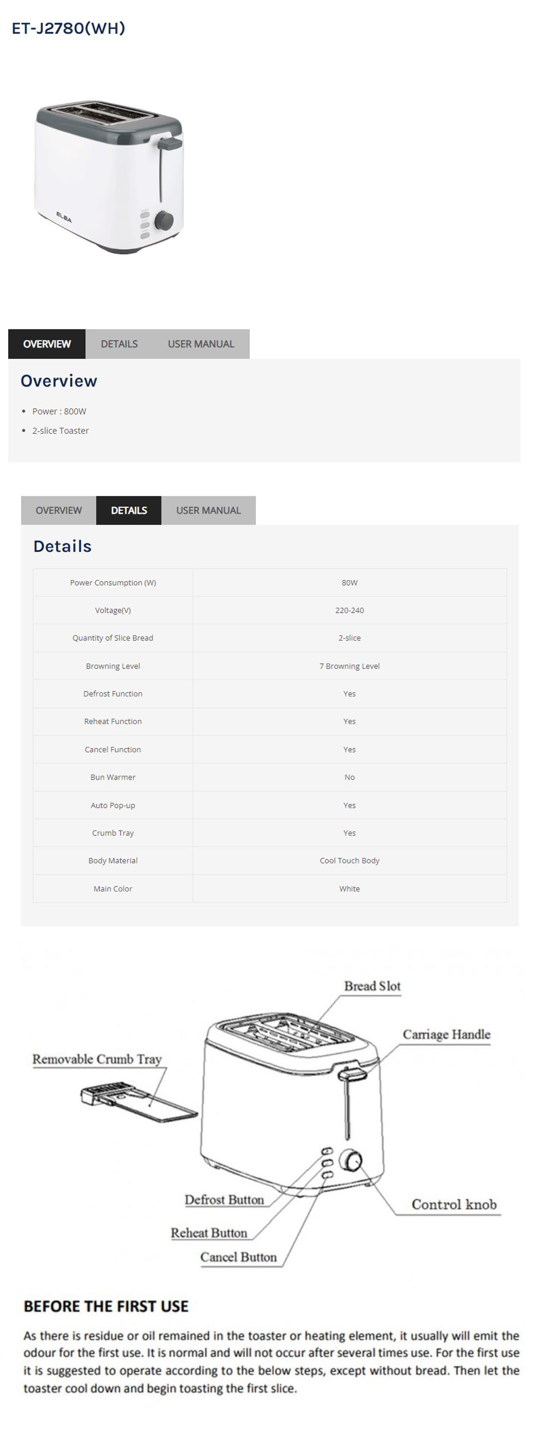 ELBA 2 Slice Bread Toaster ET-J2780(WH) | Power : 800W | 7 Browning Level | Defrost Function | Reheat Function | Cancel Function | Toaster with 1 Year Warranty