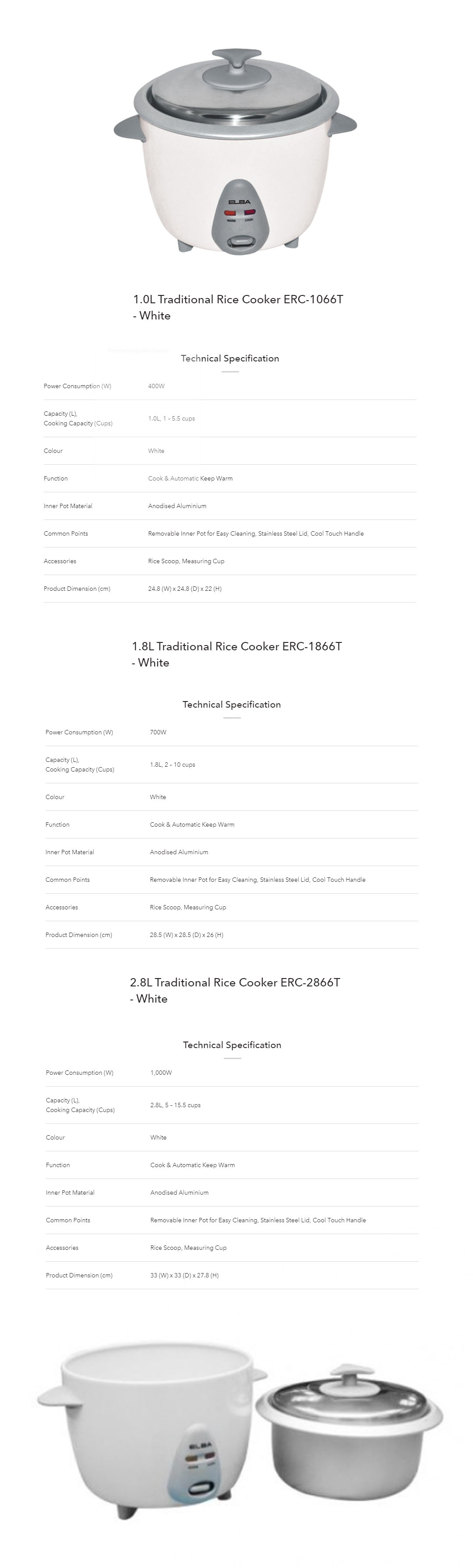 ELBA 1L/1.8L/2.8L Rice Cooker ERC-2866T/ERC-1866T/ERC-2866T | Cook & Automatic Keep Warm | Stainless Steel Lid | Cool Touch Handle | Rice Cooker with 1 Year Warranty