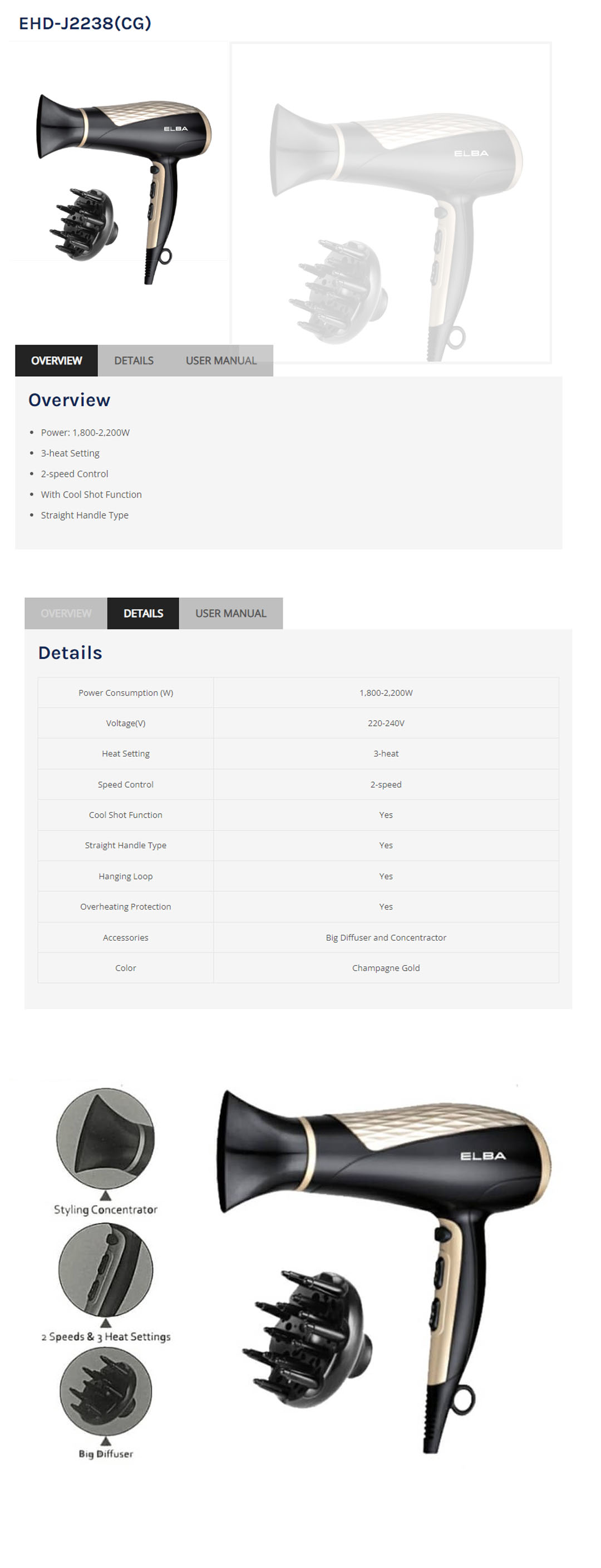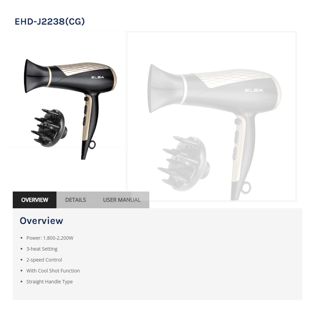 ELBA 2200W Hair Dryer EHD-J2238(CG) | With Cool Shot Function | 3-heat Setting | 2-speed Control | Straight Handle Type | Hair Dryer with 1 Year Warranty