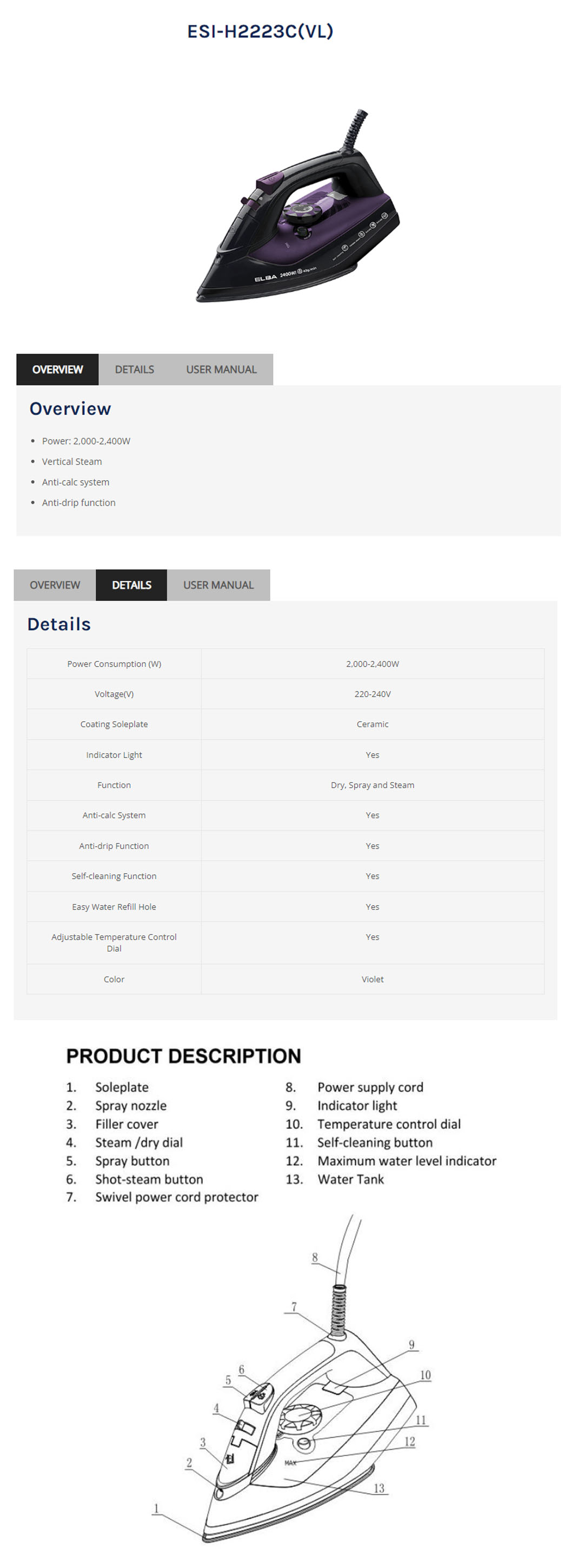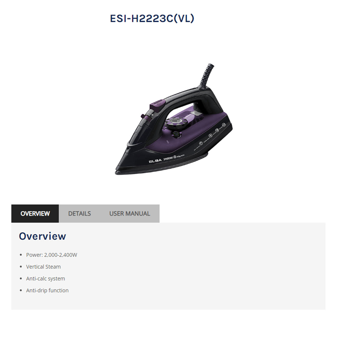 ELBA 2400W Steam Iron ESI-H2223C(VL) | Vertical Steam | Anti-calc system | Anti-drip function | Iron with 1 Year Warranty