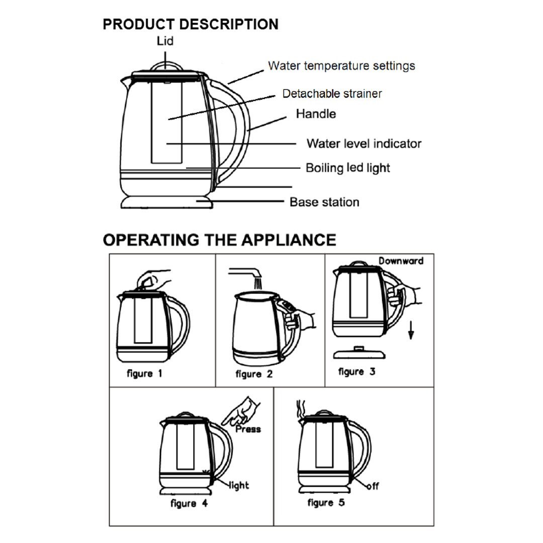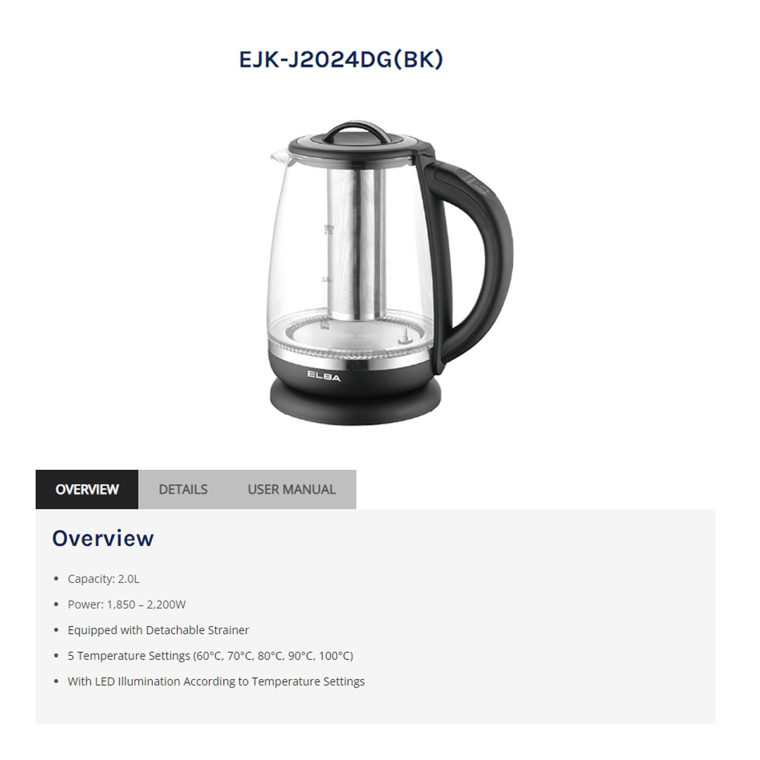 ELBA 2L Jug Kettle EJK-J2024DG(BK) | 5 Temperature Settings | With LED Illumination | Dry Boiled Protection | Equipped with Detachable Strainer | Kettle with 1 Year Warranty