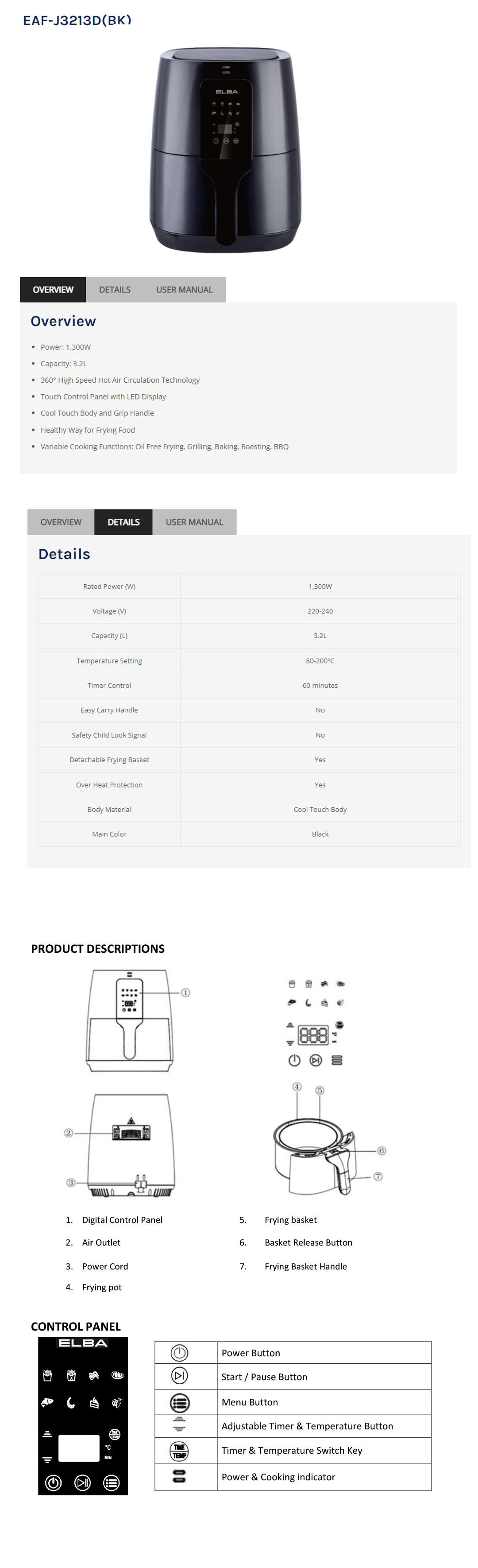 ELBA 3.2L Air Fryer EAF-J3213D(BK) | Power: 1,300W | 8 Preset Cooking Setting | Over Heat Protection | Timer Control | Air Fryer with 1 Year Warranty