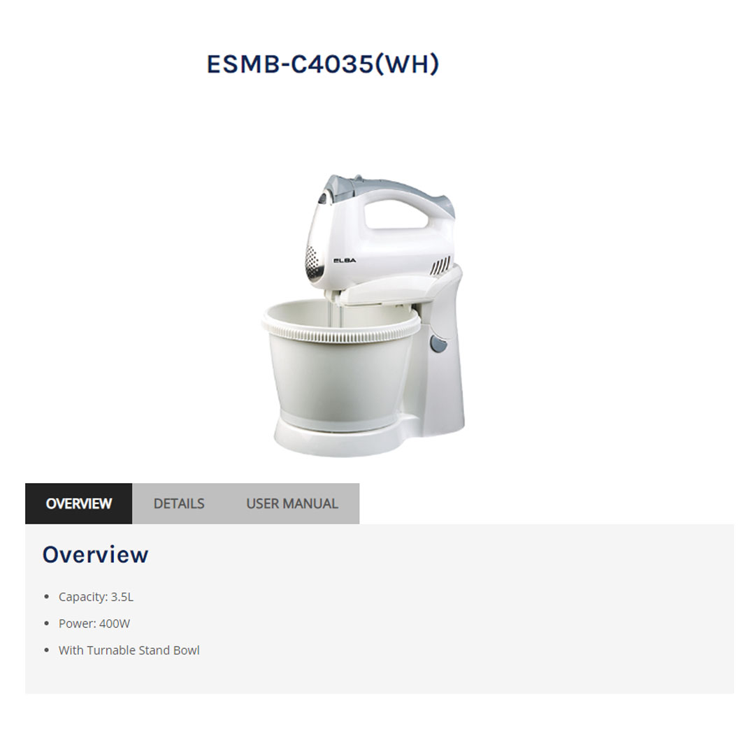 ELBA 3.5L Stand Mixer ESMB-C4035(WH) | With Turnable Stand Bowl | Power: 400W | 5-speed | Stand Mixer with 1 Year Warranty