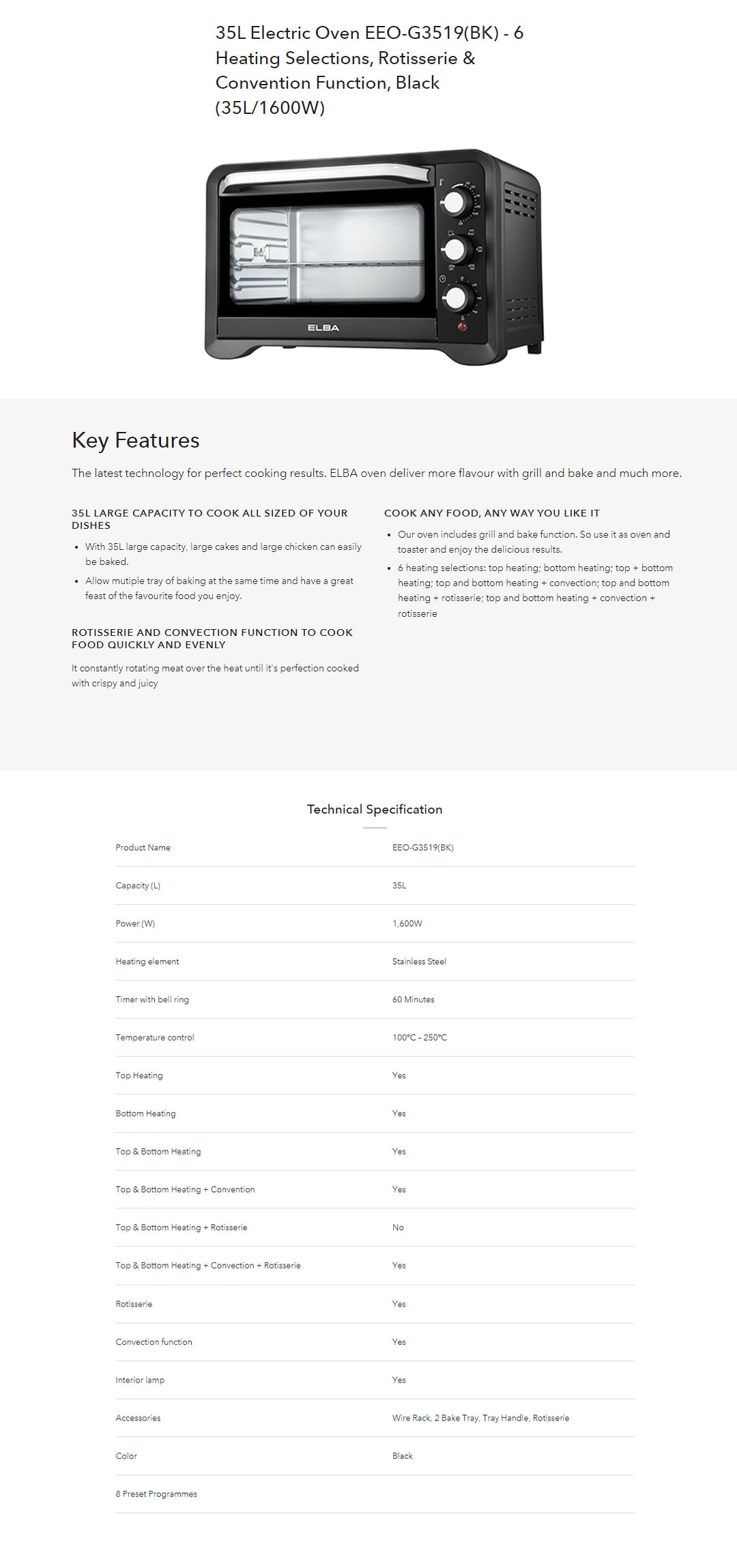 ELBA 35L/45L Oven EEO-G3519(BK)/EEO-G4529(BK) | 6 Heating Selections | Timer with bell ring | Included Wire Rack, 2 Bake Tray, Tray Handle, Rotisserie | Oven with 1 Year Warranty
