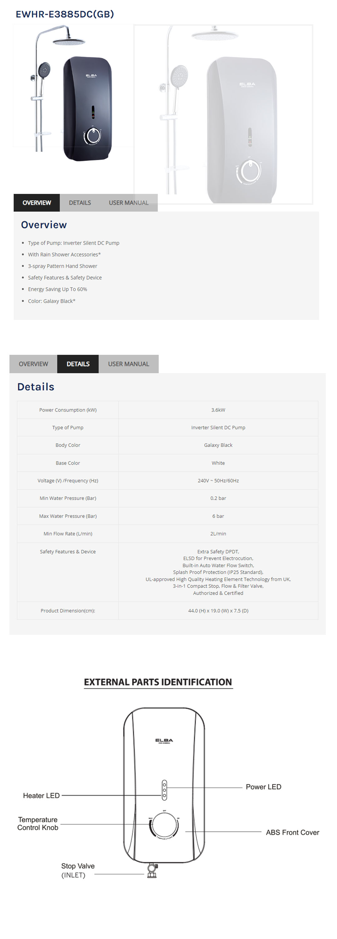 ELBA 3600W DC Pump Water Heater EWHR-E3885DC(GB) | With Rain Shower Accessories | 3-spray Pattern Hand Shower | Energy Saving Up To 60% | Water Heater with 1 Year Warranty