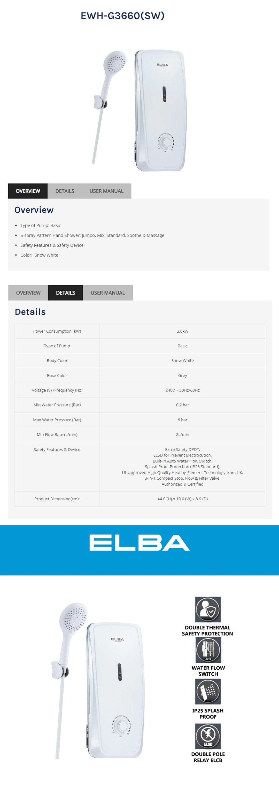 ELBA 3600W Water Heater Snow EWH-G3660(SW) | Safety Features & Safety Device | Extra Safety DPDT | ELSD for Prevent Electrocution | Splash Proof Protection (IP25 Standard) | Water Heater with 1 Year Warranty