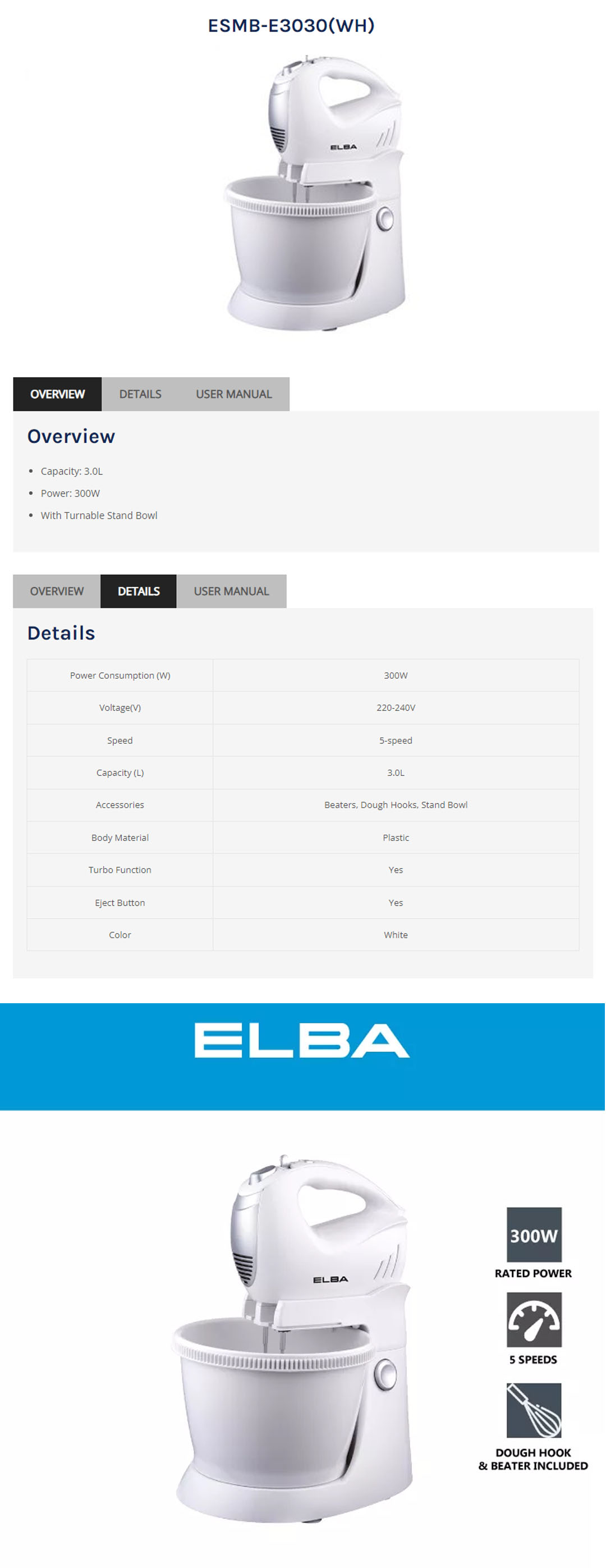 ELBA 3L Stand Mixer ESMB-E3030(WH) | With Turnable Stand Bowl | 5-speed | Included Beaters, Dough Hooks, Stand Bowl | Stand Mixer with 1 Year Warranty