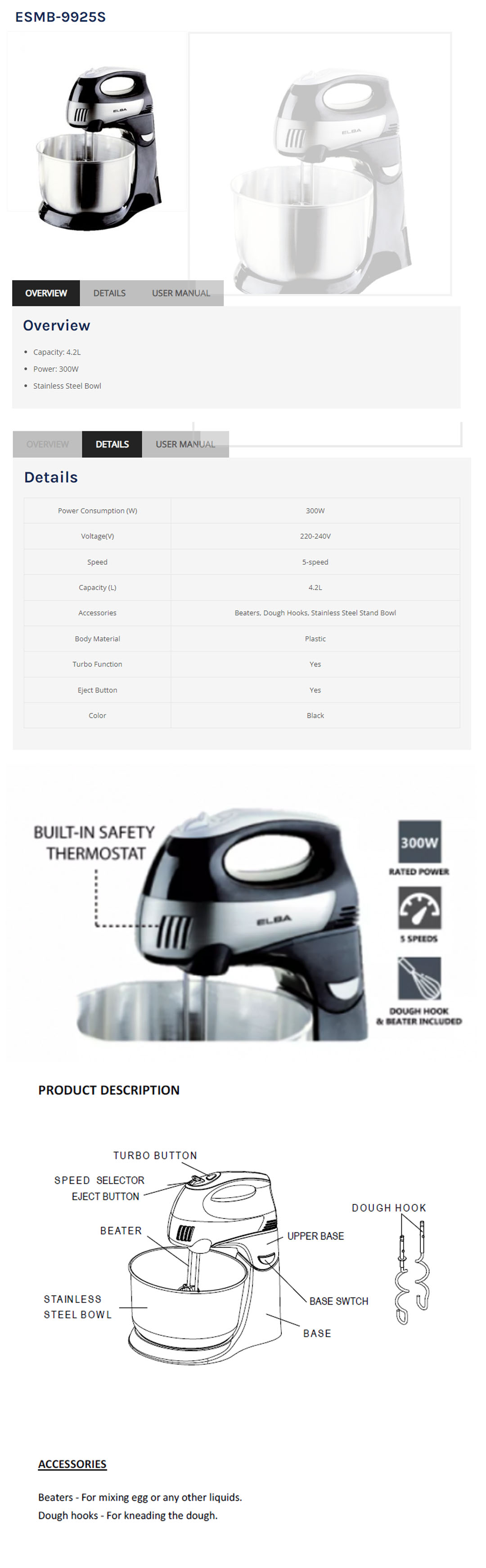 ELBA 4.2L Stand Mixer ESMB-9925S | Included Beaters, Dough Hooks, Stainless Steel Stand Bowl | Turbo Function | Eject Function | Stand Mixer with 1 Year Warranty