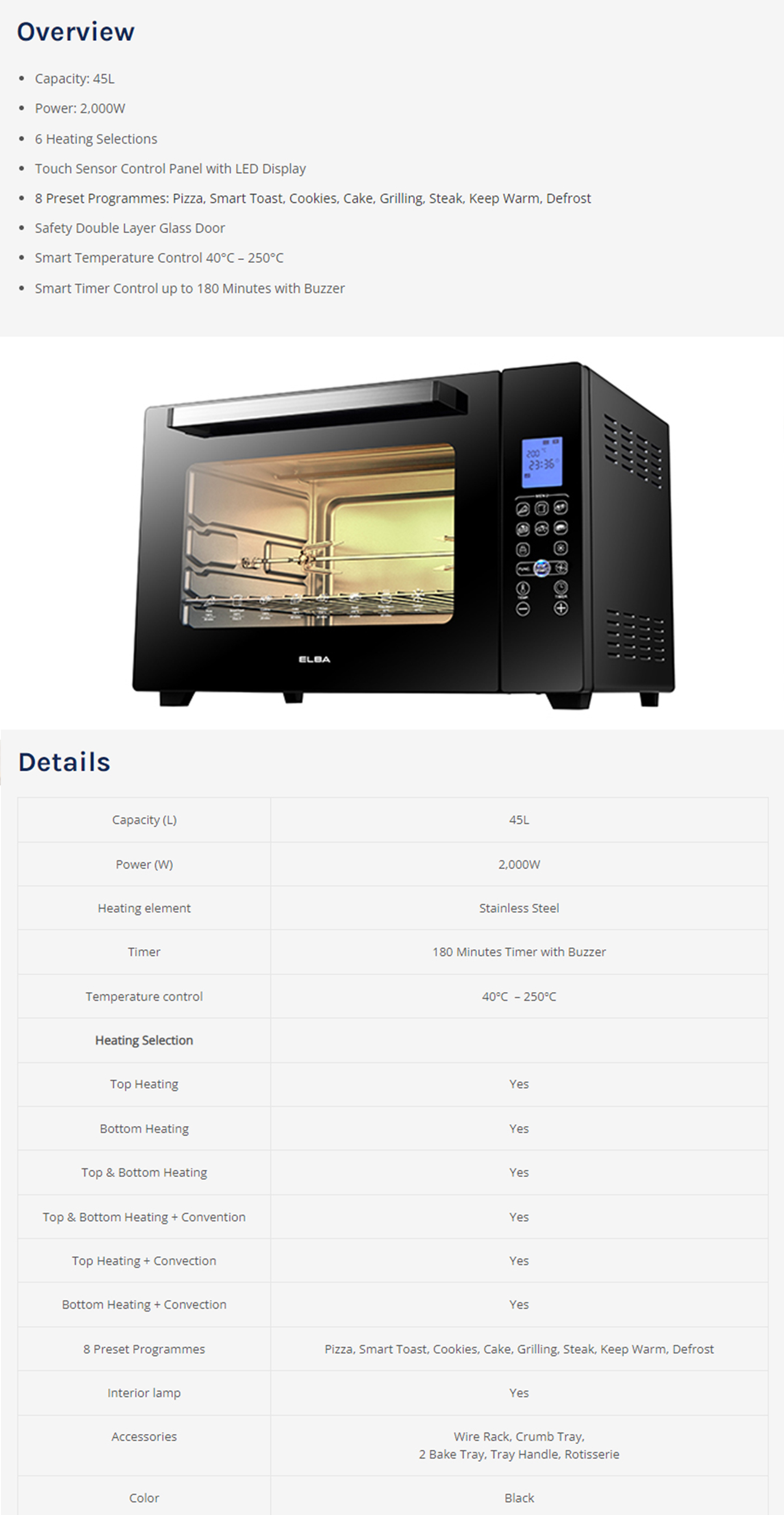 ELBA 45L Electric Oven EEO-J4591D(BK) | 6 Heating Selections | 8 Preset Programmes | Safety Double Layer Glass Door | Smart Timer Control up to 180 Minutes with Buzzer | Oven with 1 Year Warranty