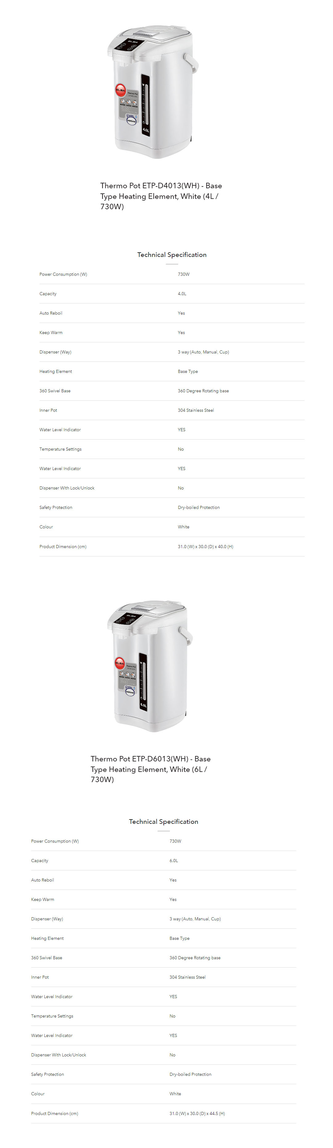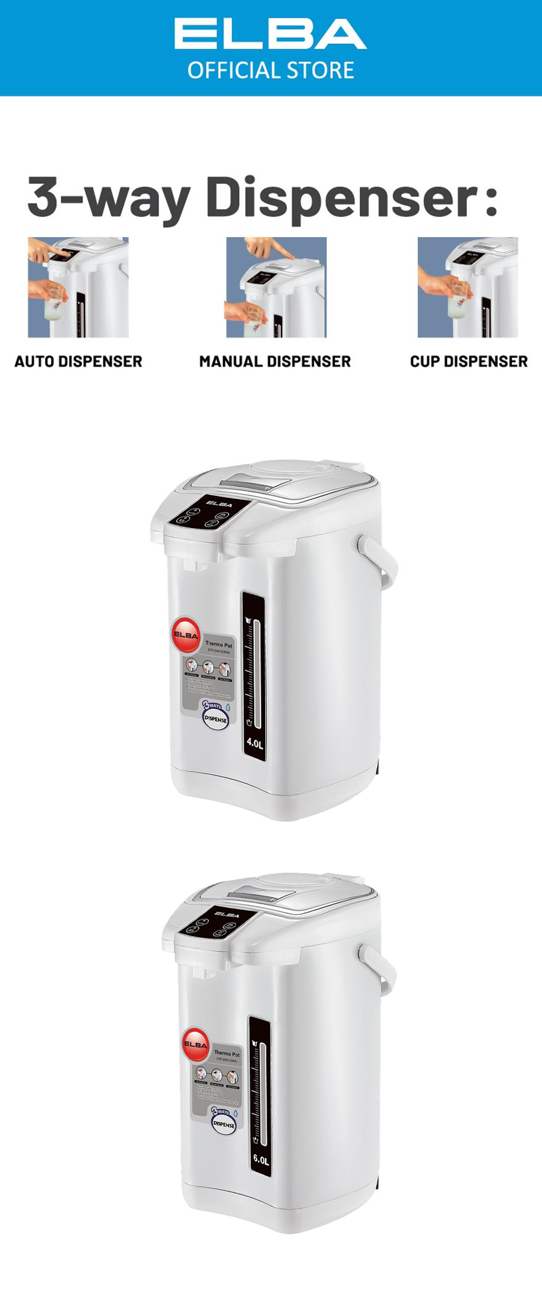 ELBA 4L | 6L Thermo Pot ETP-D4013(WH)/ETP-D6013(WH) | 3 Ways Dispenser | 360 Degree Rotating base | 304 Stainless Steel | Dry-boiled Protection | Thermo Pot with 1 Year Warranty