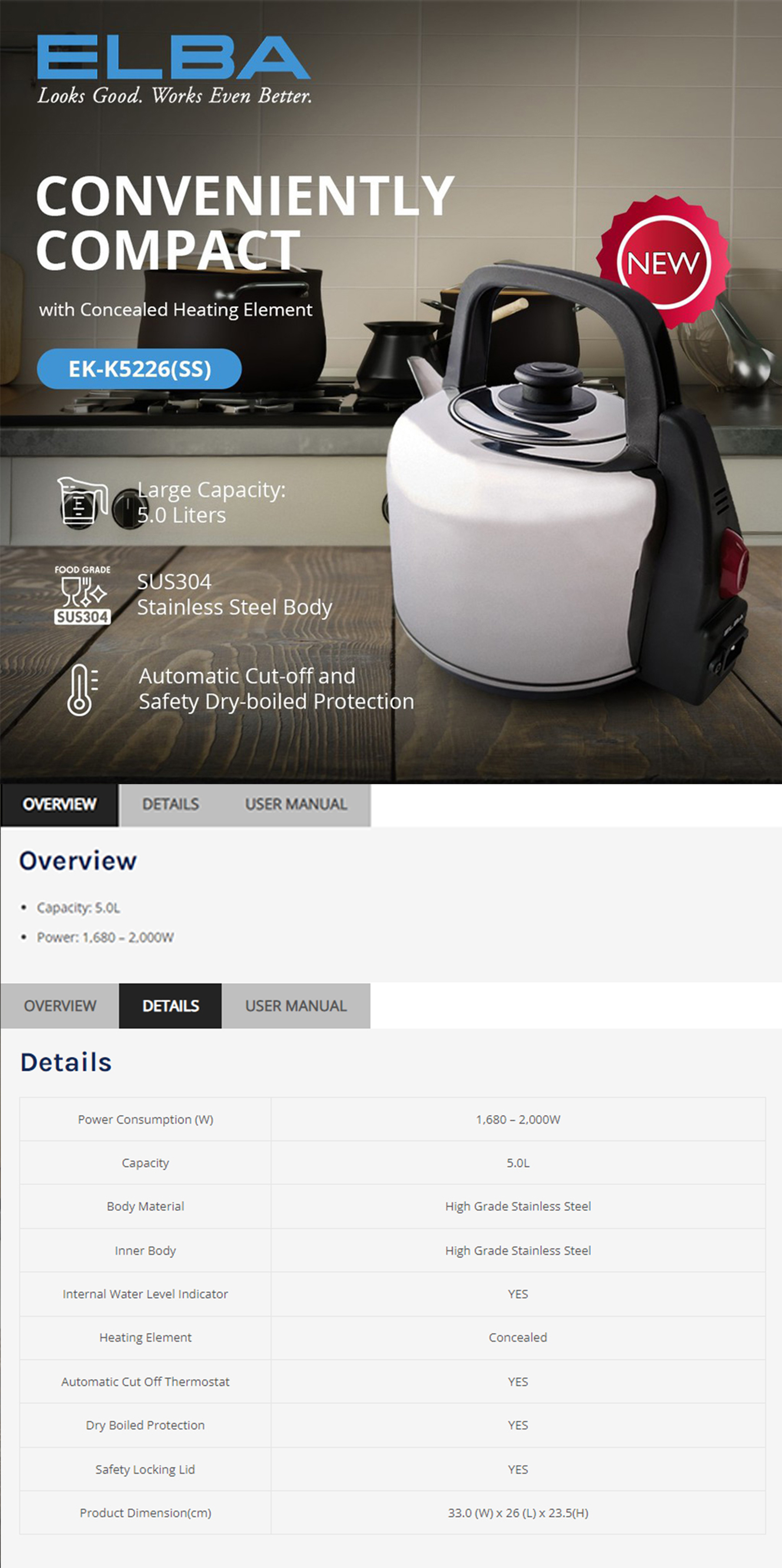 ELBA 5L Electric Kettle Stainless Steel EK-K5226(SS) | Concealed Heating Element | Automatic Cut Off Thermostat | Dry Boiled Protection | Safety Locking Lid | Kettle with 1 Year Warranty