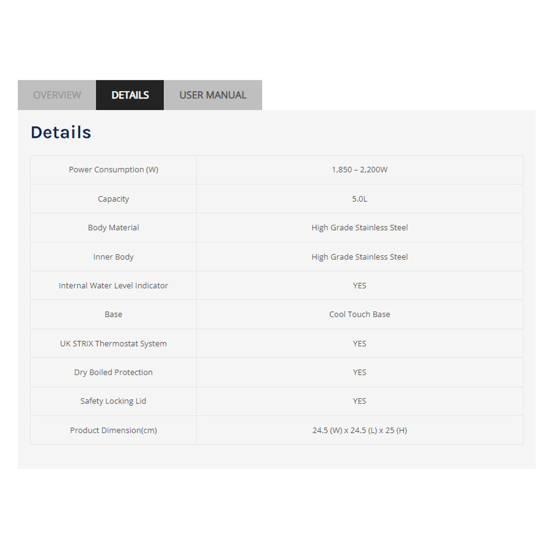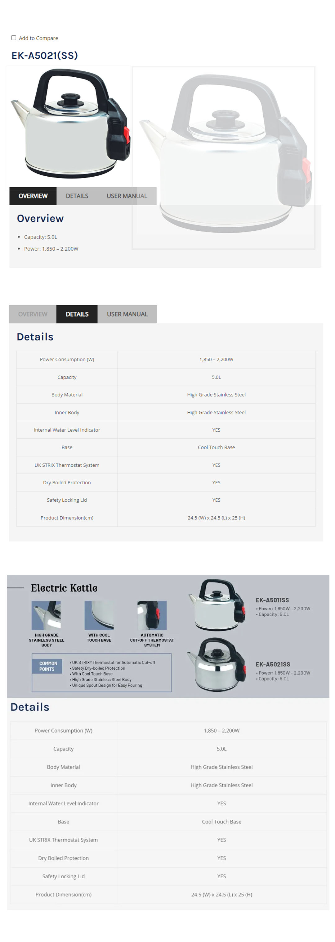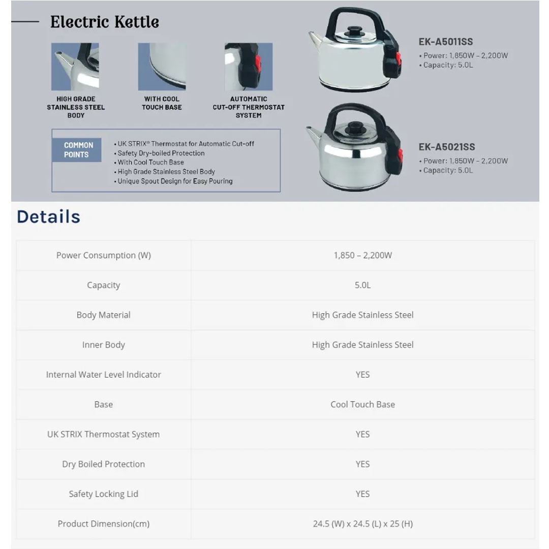 ELBA 5L Kettle Stainless Steel EK-A5021(SS) | UK STRIX Thermostat System | Dry Boiled Protection | Safety Locking Lid | Kettle with 1 Year Warranty