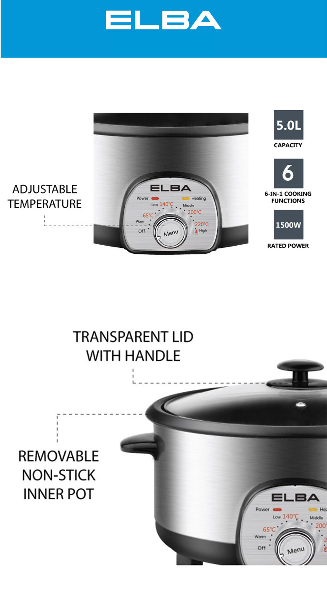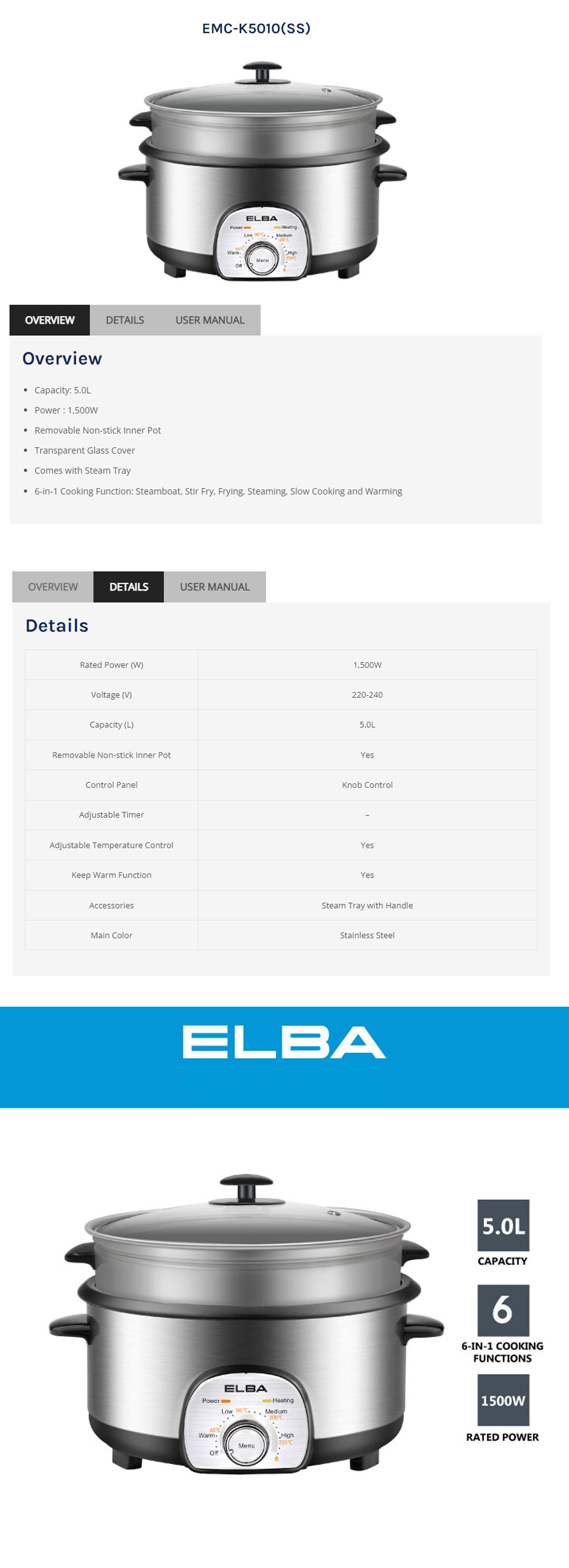 ELBA 5L Multi Cooker EMC-K5010(SS) | 6-in-1 Cooking Function | Power : 1,500W | Comes with Steam Tray | Removable Non-stick Inner Pot | Multi Cooker with 1 Year Warranty